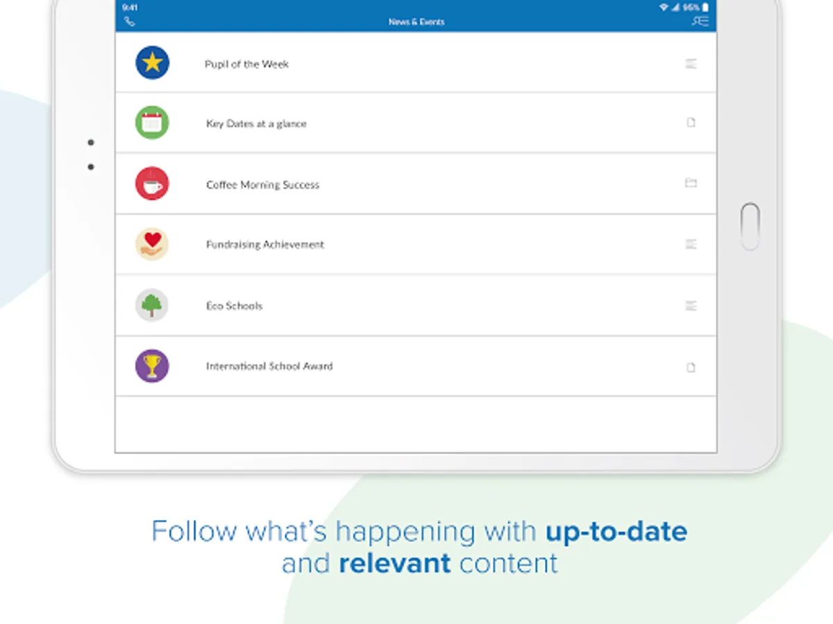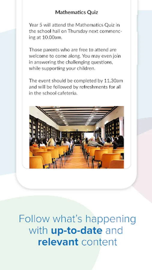 The app provides a set of content areas that the School can use to publish key information content such as school policies, educational materials, timetables, canteen menus, etc.