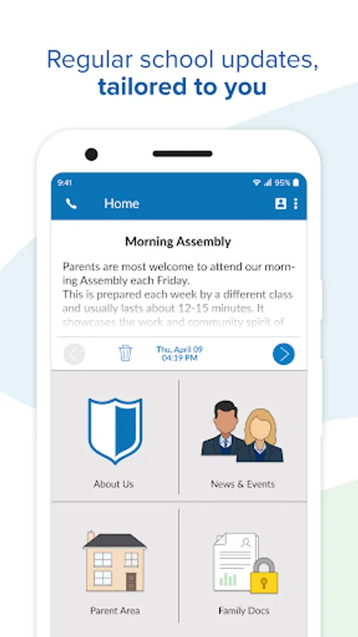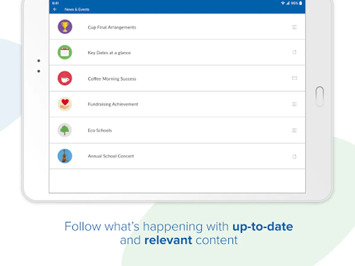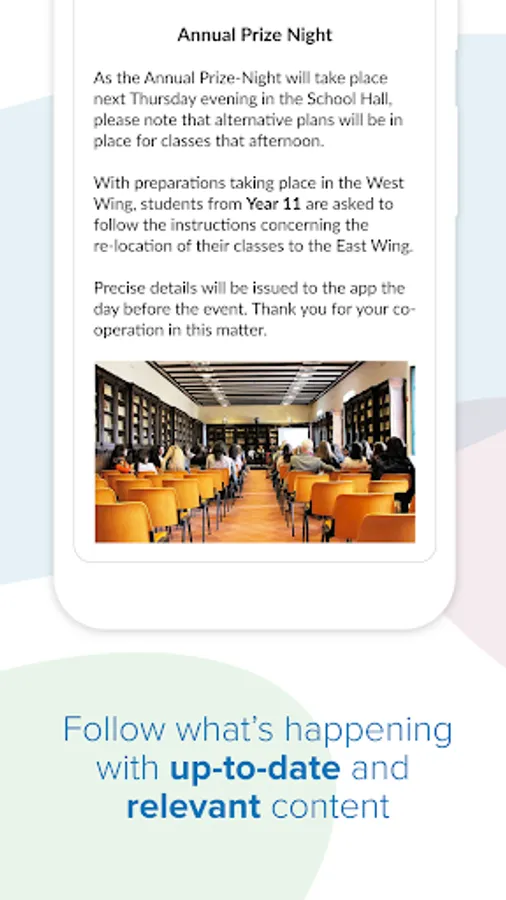 The app provides a set of content areas that the School can use to publish key information content such as school policies, educational materials, timetables, canteen menus, etc.