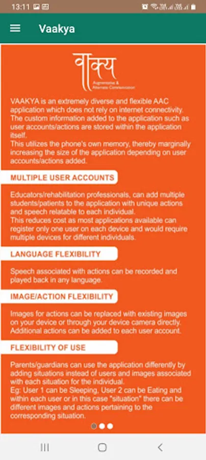 Vaakya is a picture based AAC app designed for people with speech impairments.This may be in the case of aphasia, MND/ALS, after a stroke, in case of vocal cord problems or other speech problems. It is also suitable for Individuals affected by autism, cerebral palsy and various other mental and physical conditions. The app is an AAC (Augmentative and Alternative Communication) tool and can also be used to practice during rehabilitation. Even for individuals with such conditions that are unable to read, it works as an effective tool to communicate as it depends on images and audio instead of text.