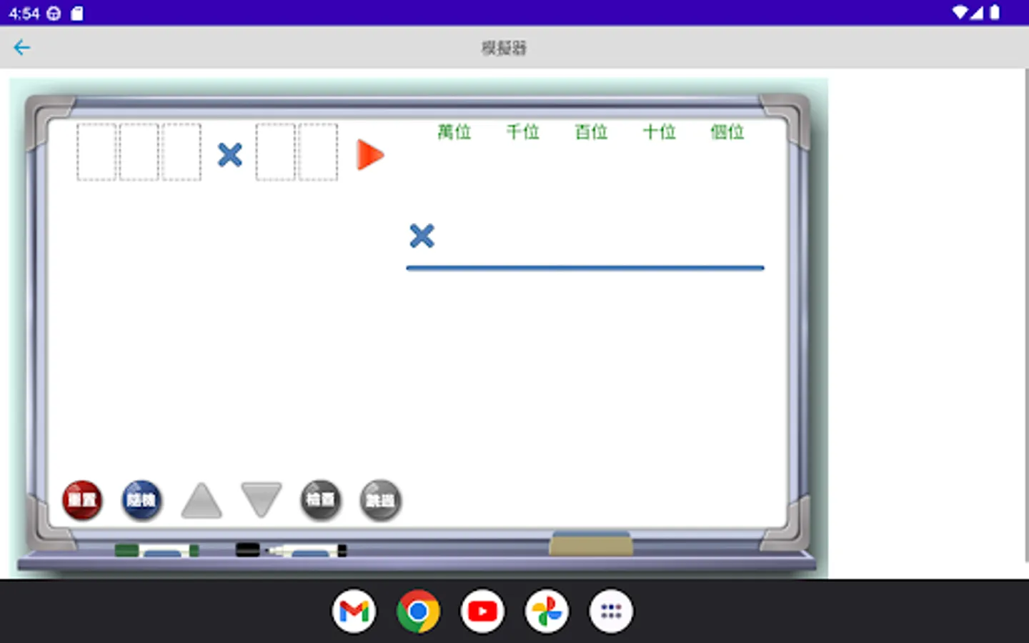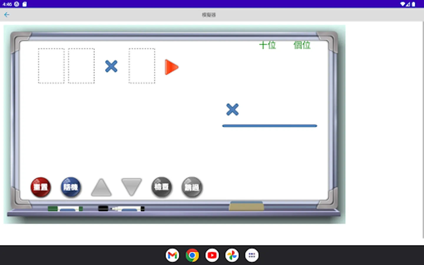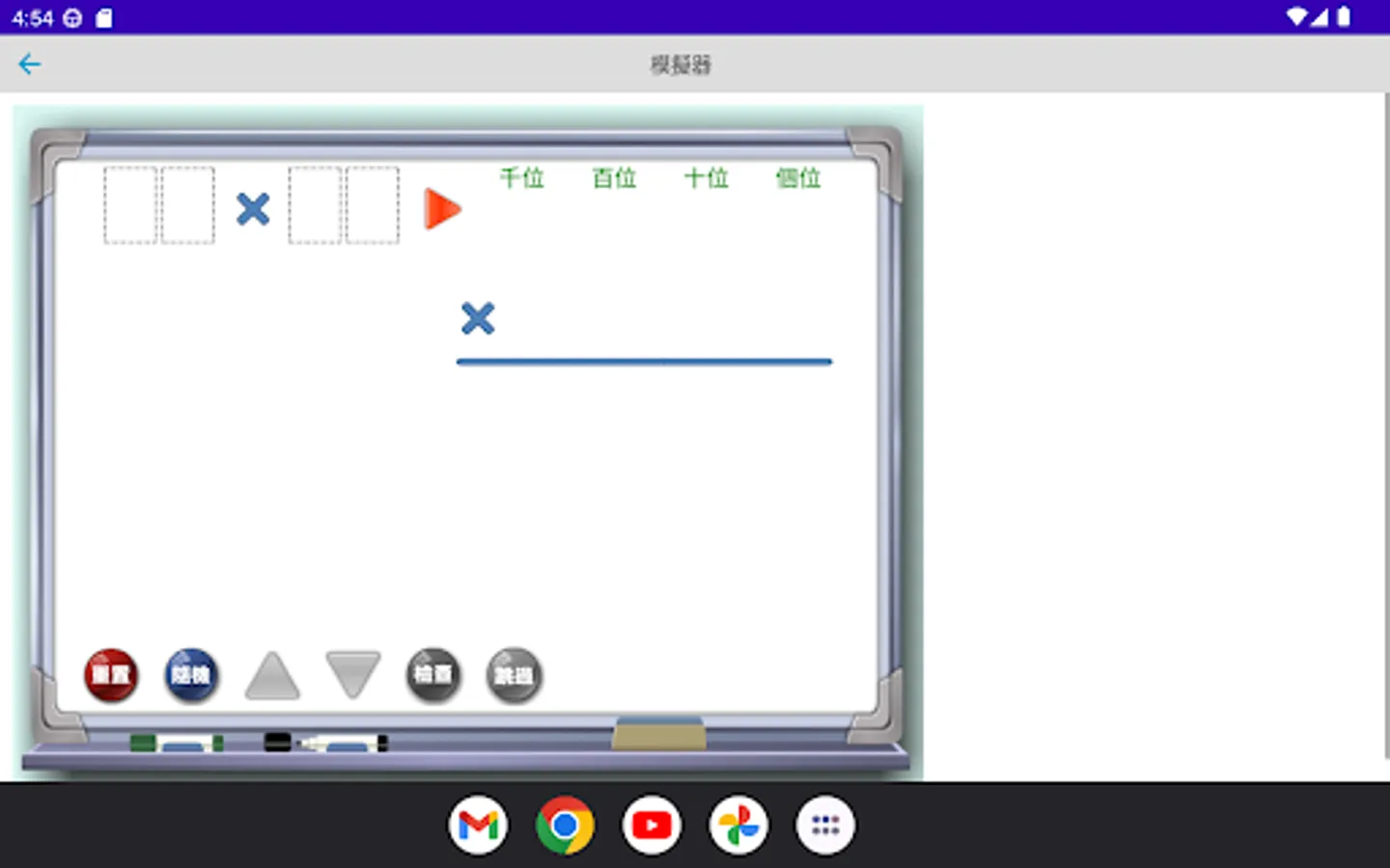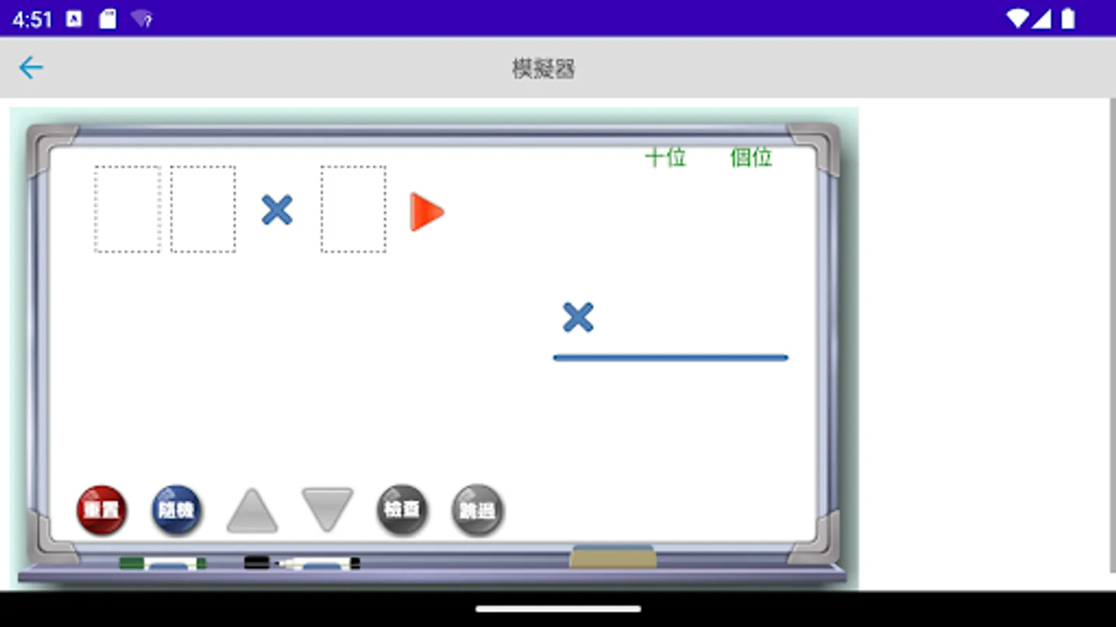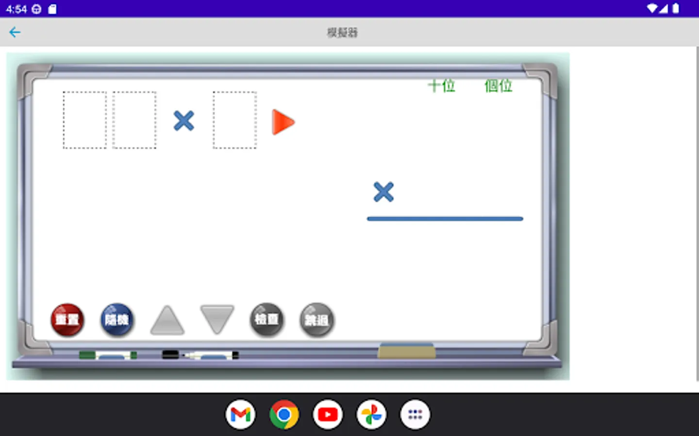 The multiplication simulator is a multiplication calculation application developed by "Mingchuang Education New Asia Publishing House" (this application is specially designed for tablet computers, if you open it with a mobile phone, there may be insufficient resolution); by providing different forms The multiplication type analog of