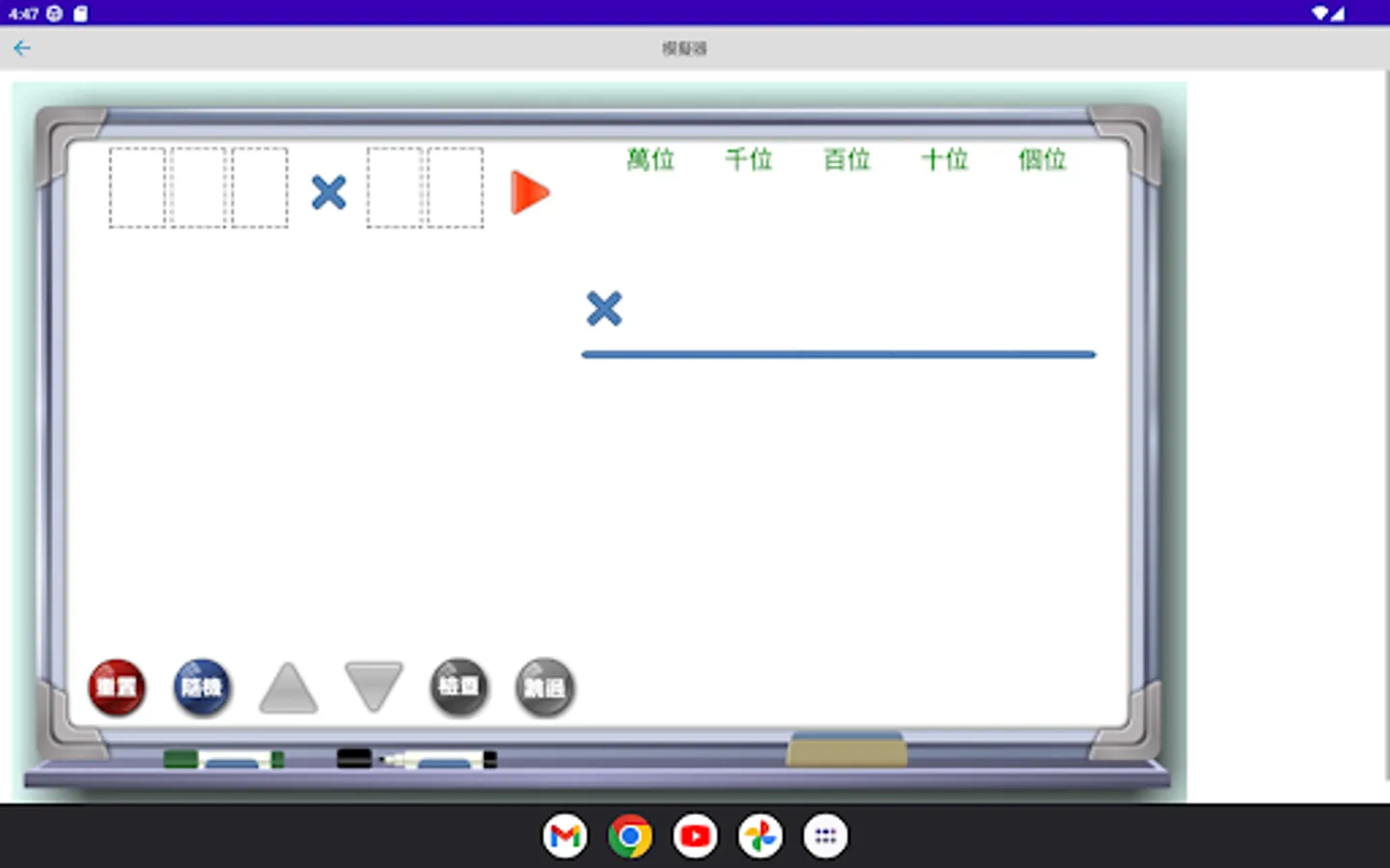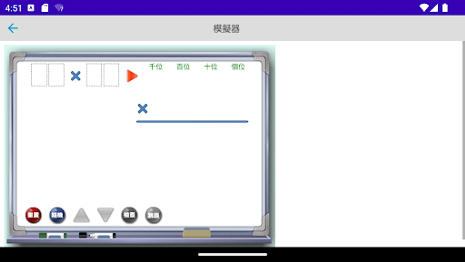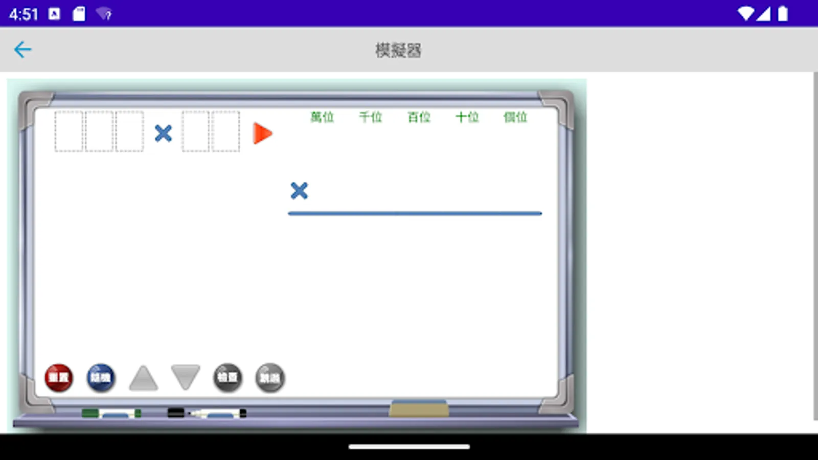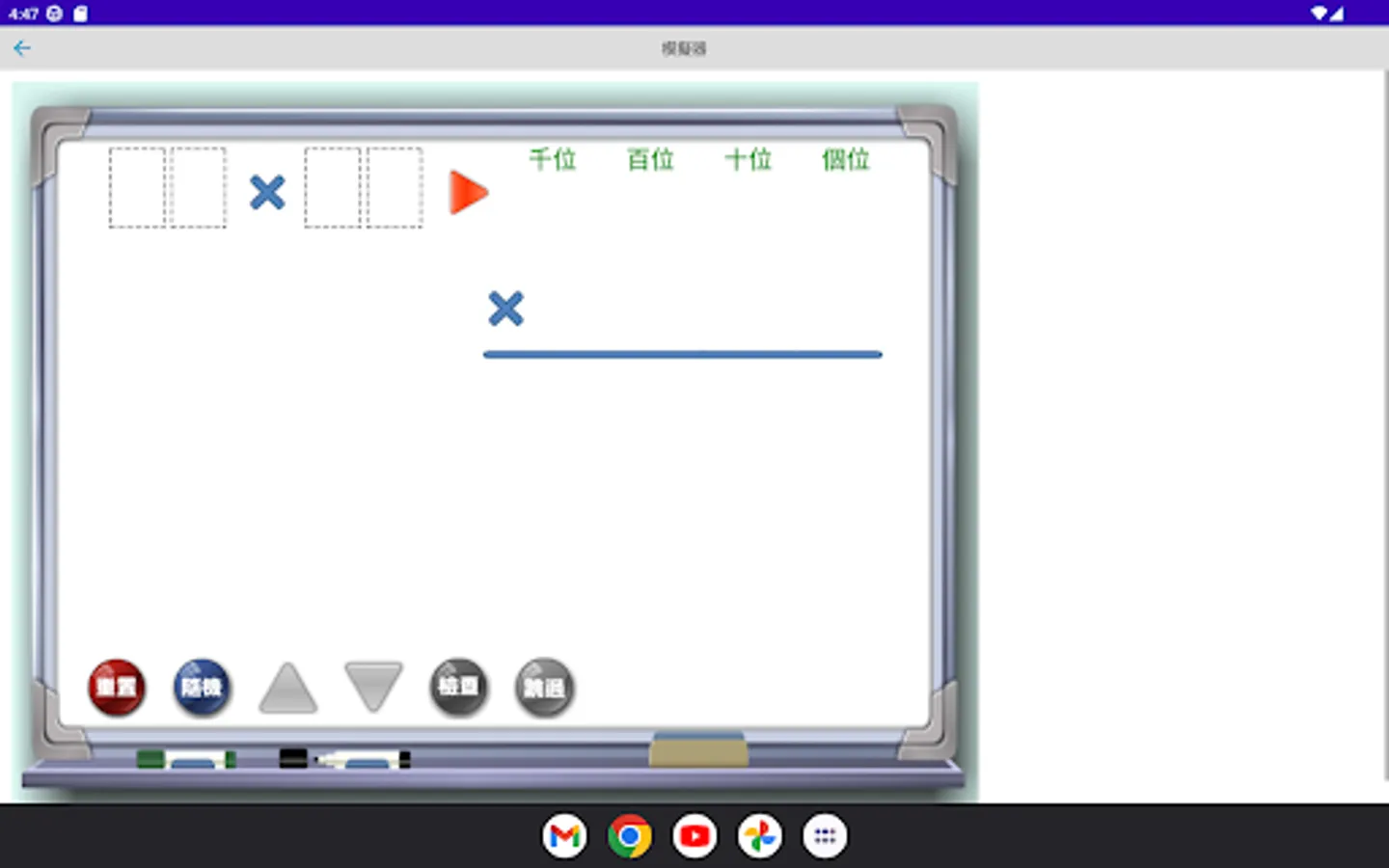 The multiplication simulator is a multiplication calculation application developed by "Mingchuang Education New Asia Publishing House" (this application is specially designed for tablet computers, if you open it with a mobile phone, there may be insufficient resolution); by providing different forms The multiplication type analog of