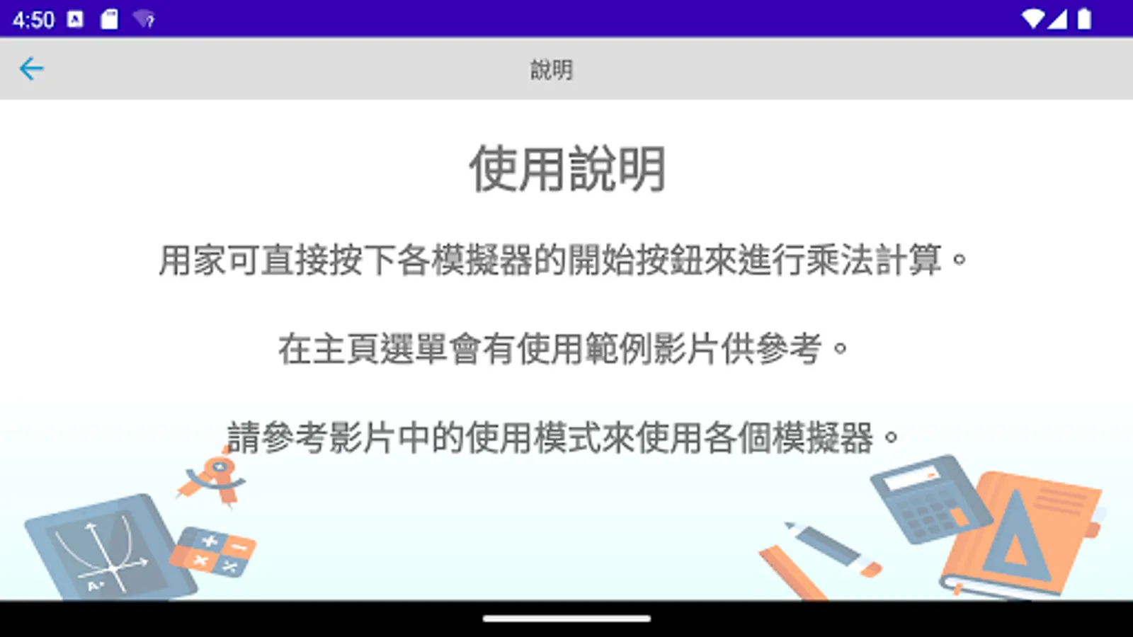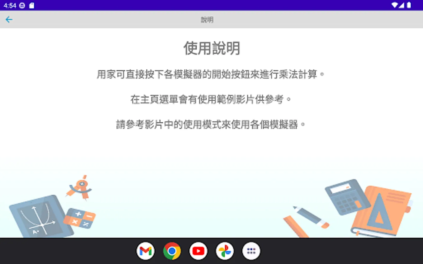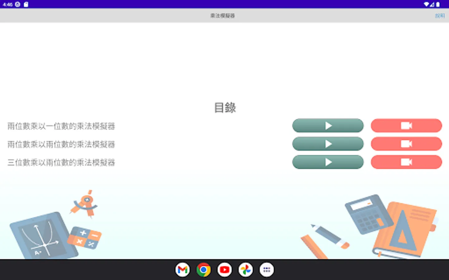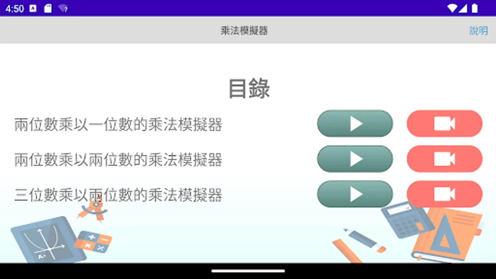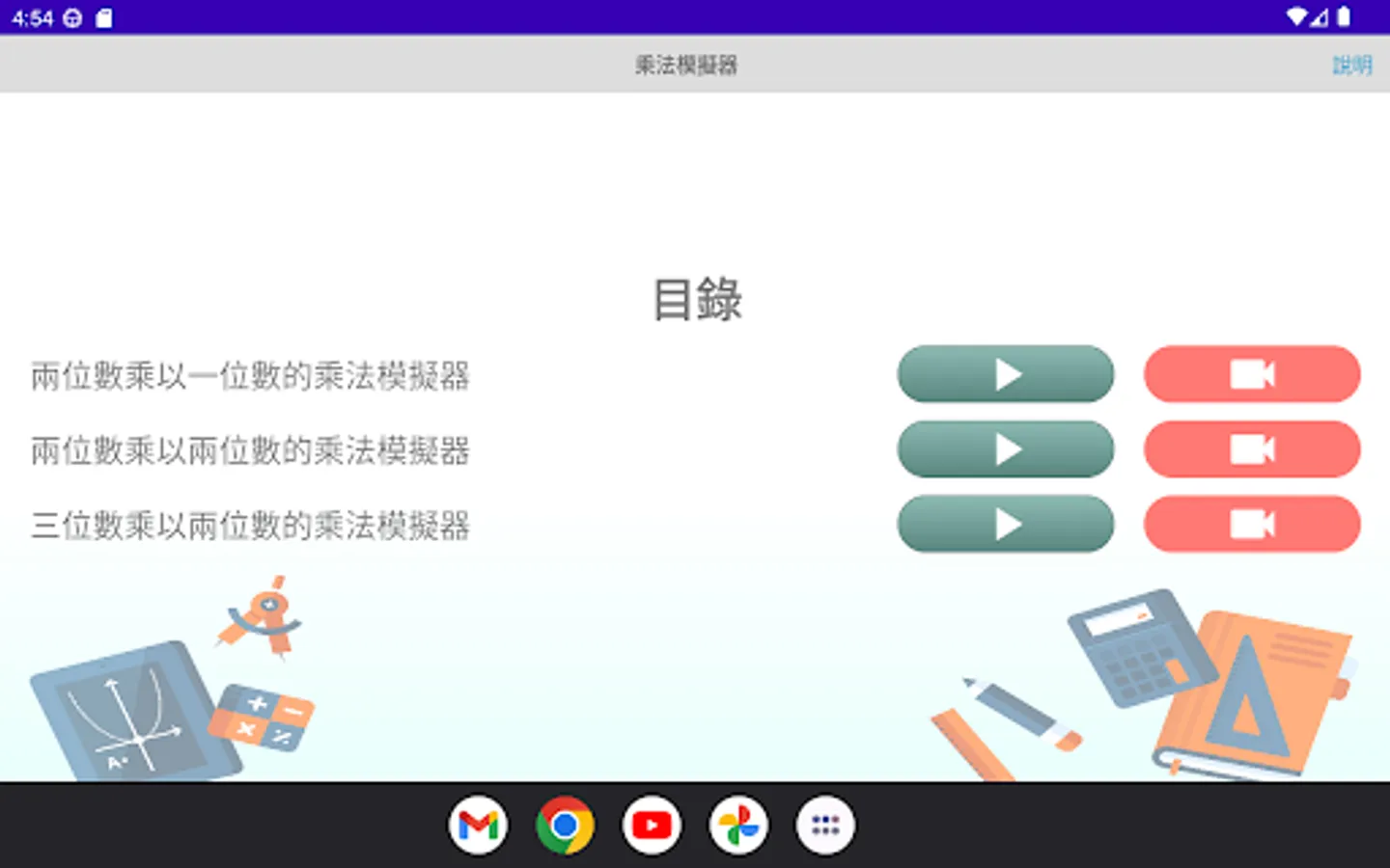 The multiplication simulator is a multiplication calculation application developed by "Mingchuang Education New Asia Publishing House" (this application is specially designed for tablet computers, if you open it with a mobile phone, there may be insufficient resolution); by providing different forms The multiplication type analog of