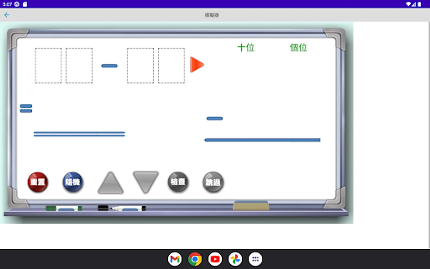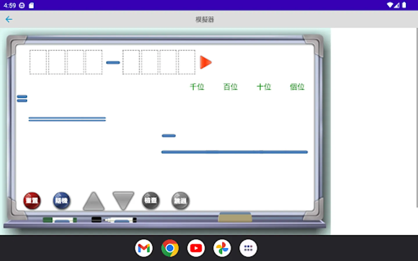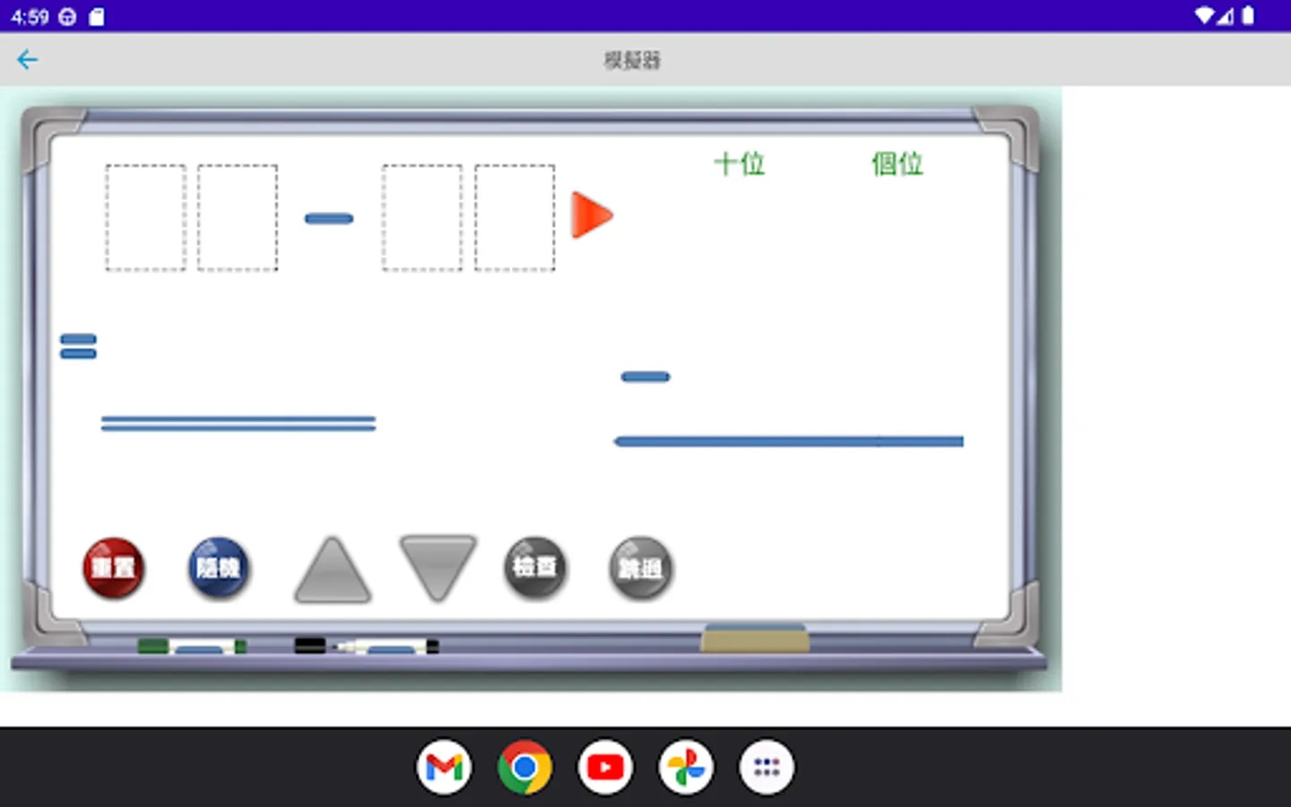 The subtraction simulator is a subtraction calculation application developed by "Mingchuang Education·New Asia Publishing House" (this application is specially designed for tablet computers, if you open it with a mobile phone, there may be insufficient resolution); by providing different forms The subtraction type analog of