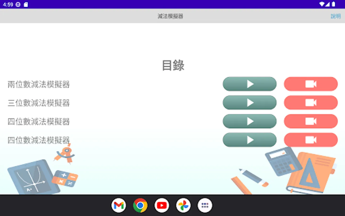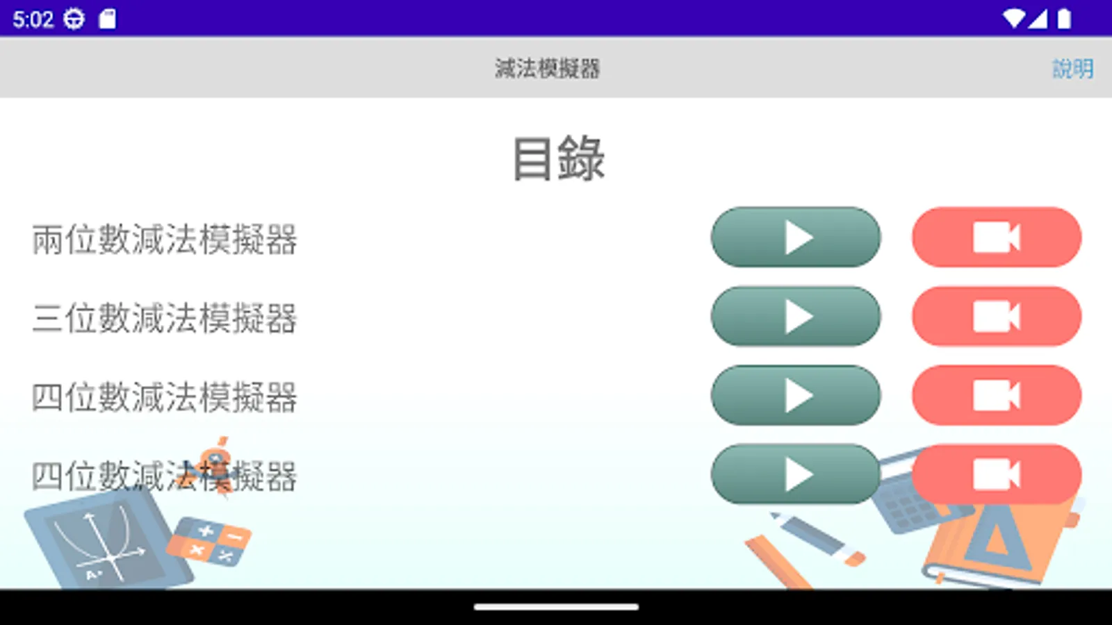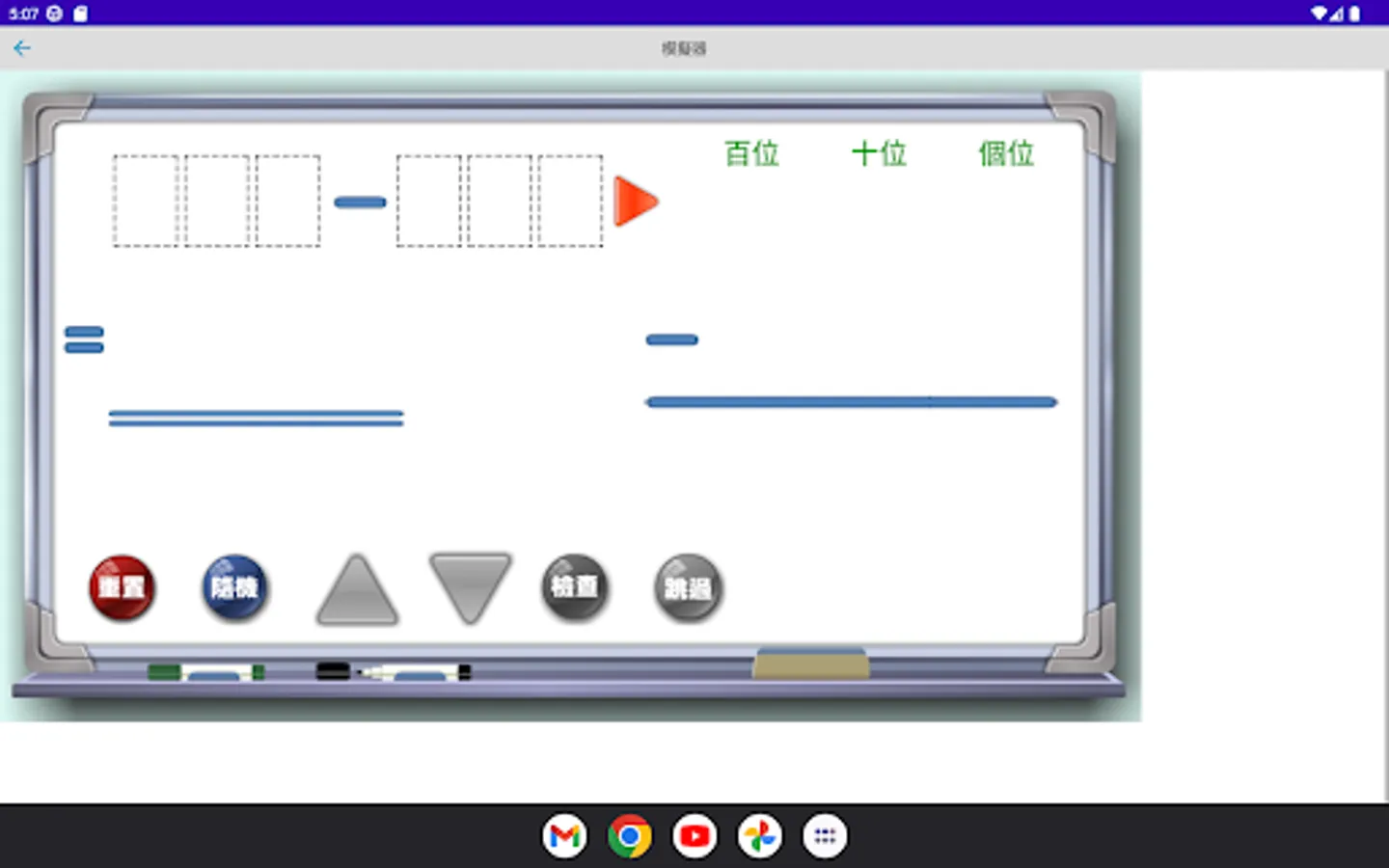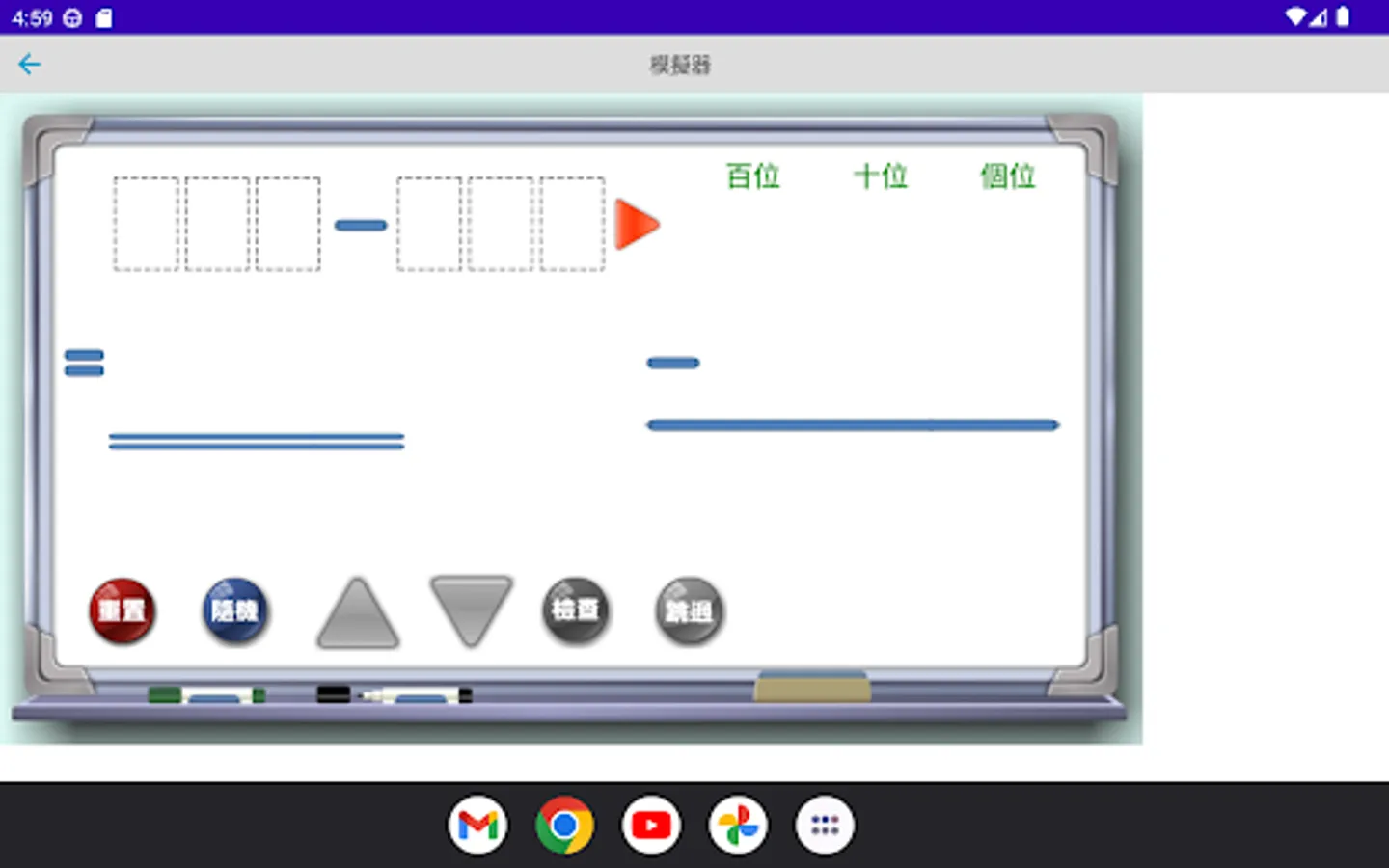 The subtraction simulator is a subtraction calculation application developed by "Mingchuang Education·New Asia Publishing House" (this application is specially designed for tablet computers, if you open it with a mobile phone, there may be insufficient resolution); by providing different forms The subtraction type analog of