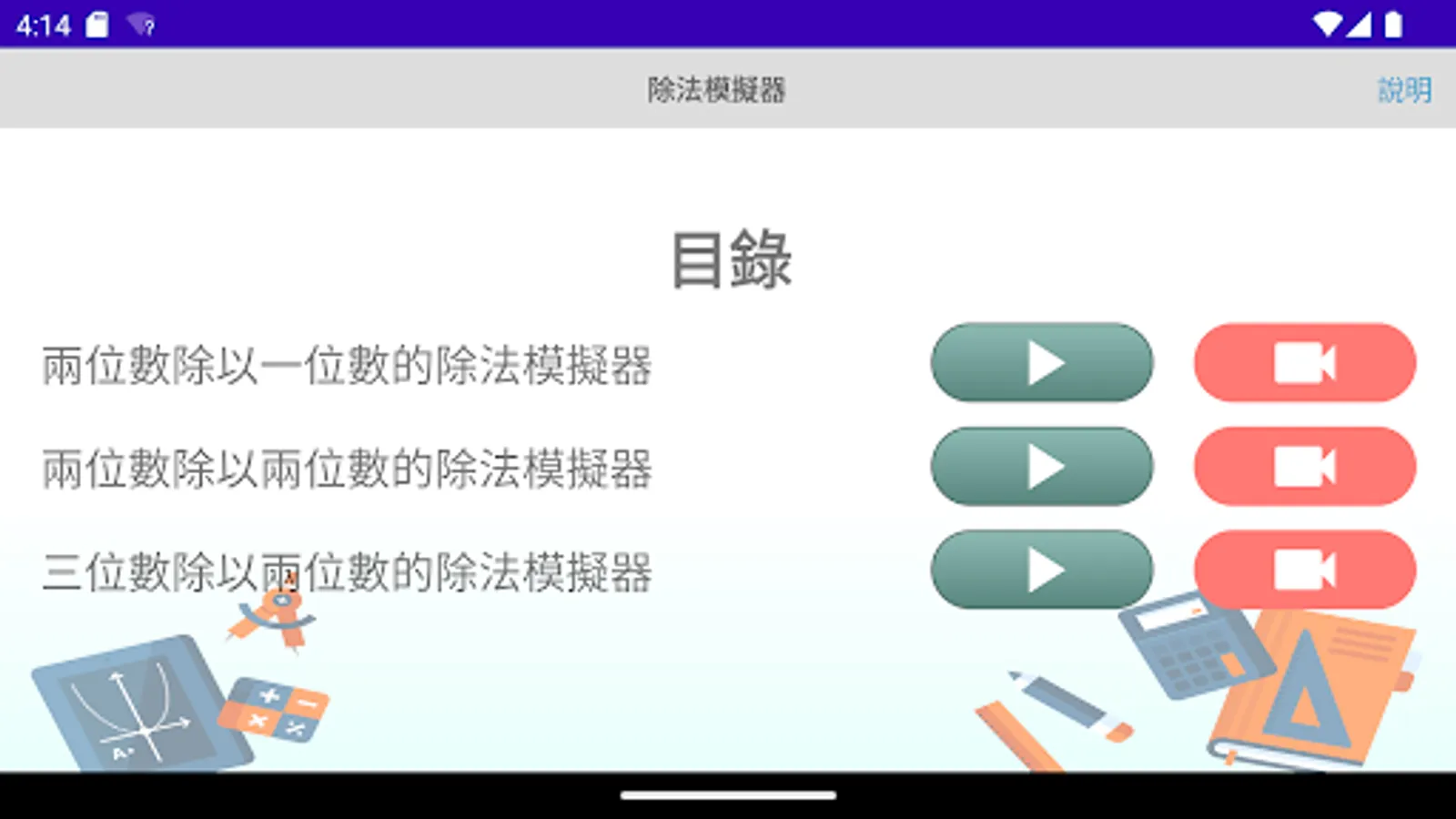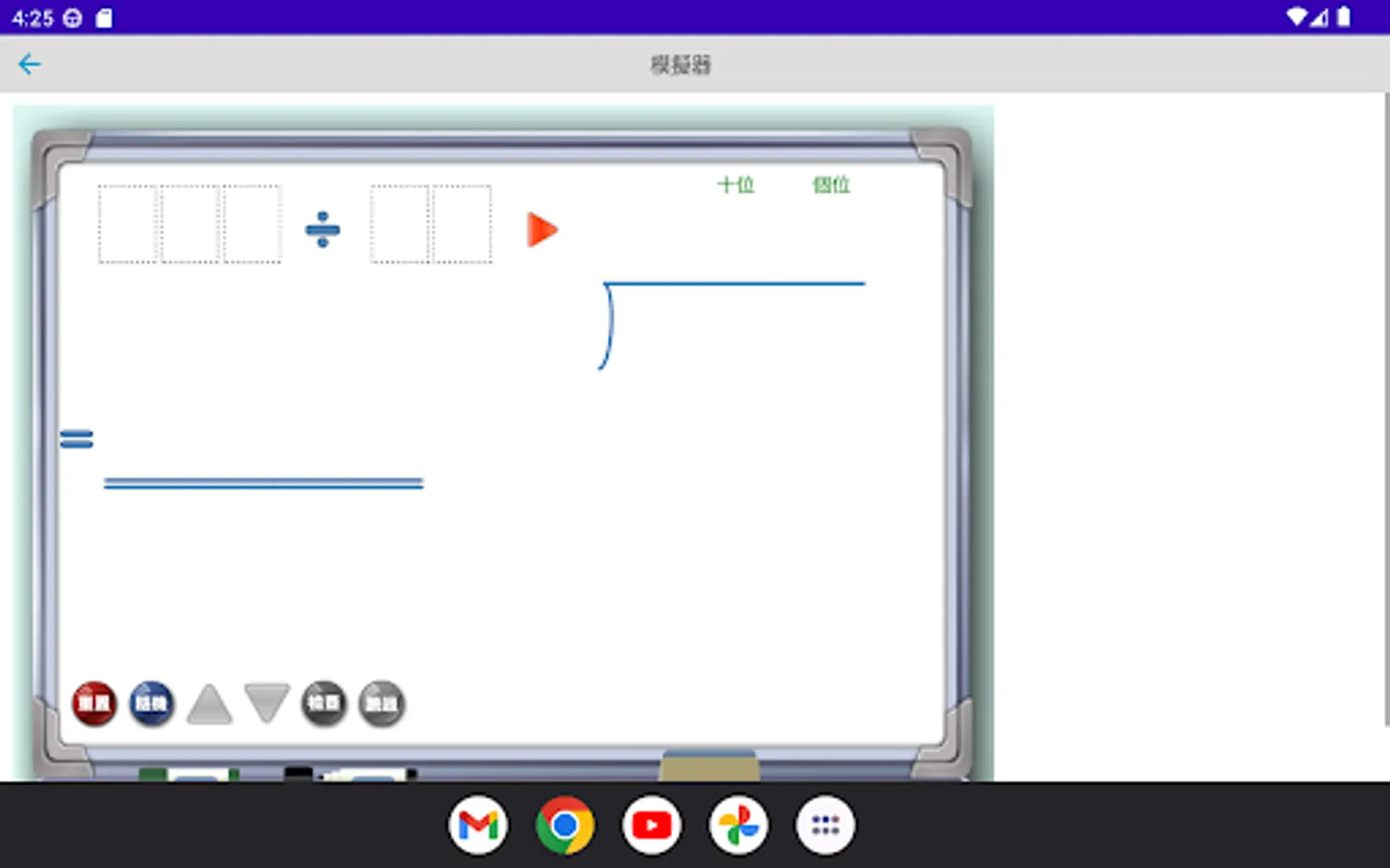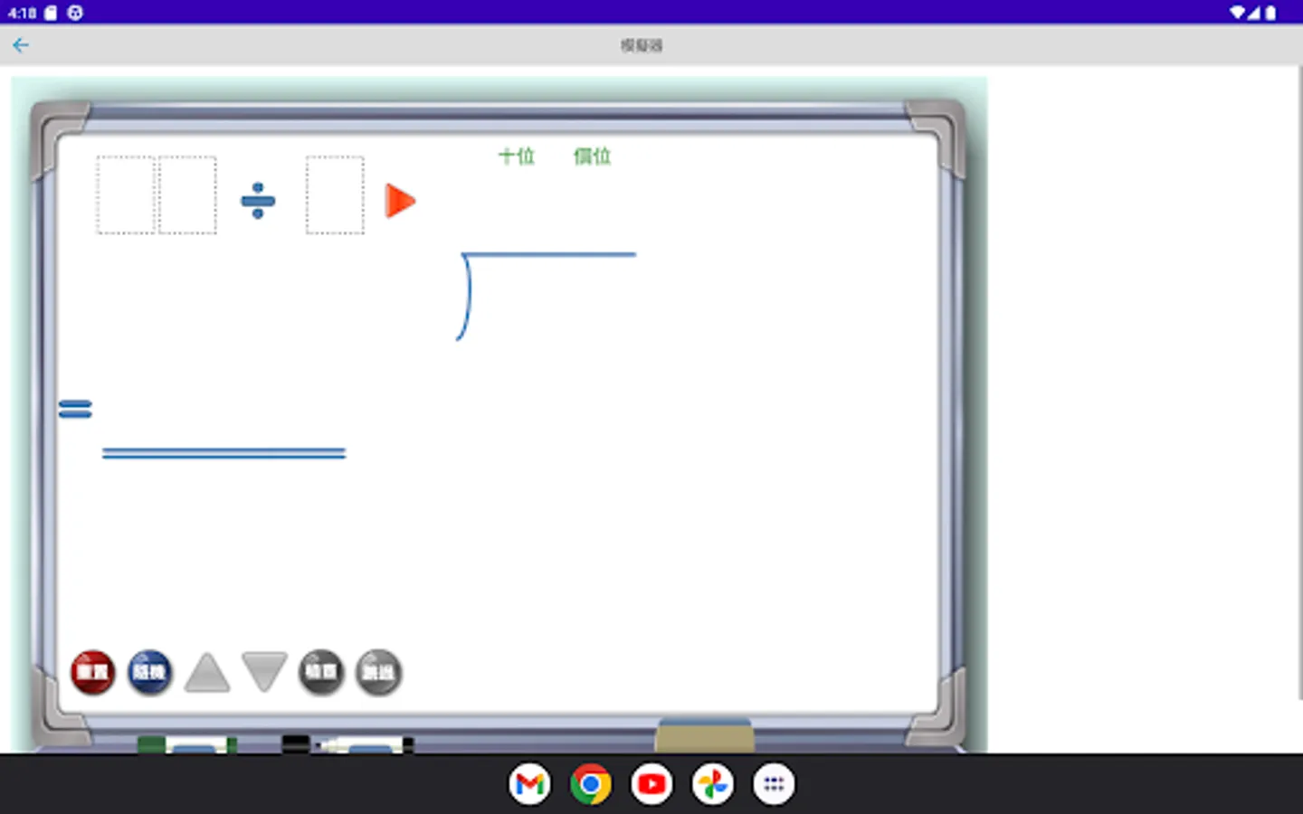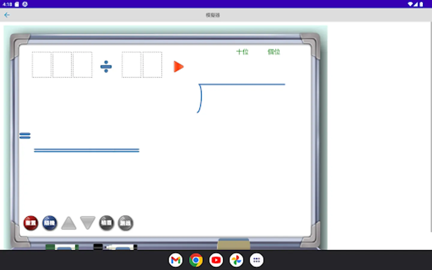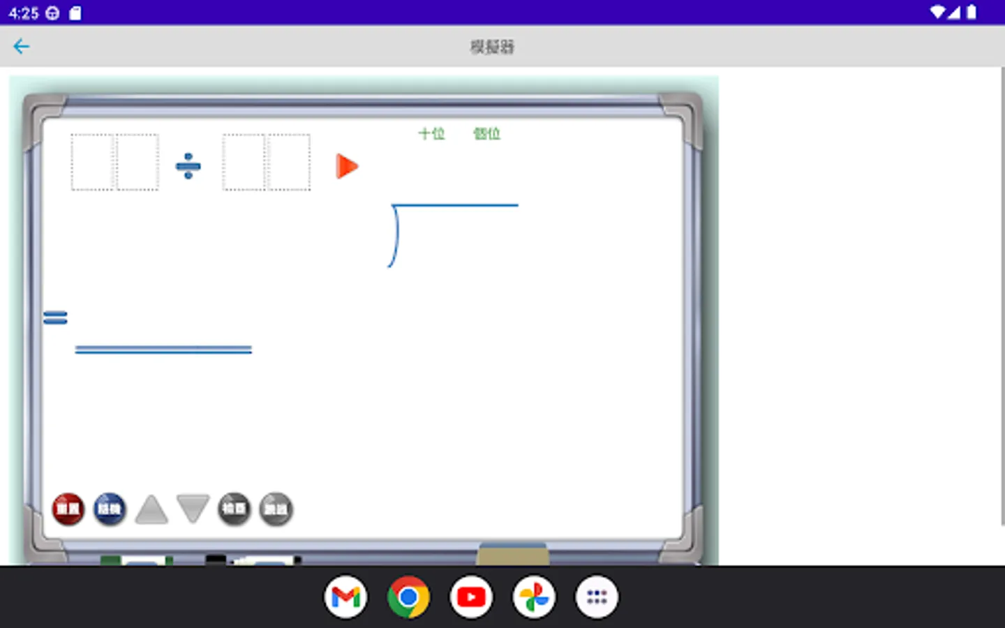 The division simulator is a division calculation application developed by "Mingchuang Education·New Asia Publishing House" (this application is specially designed for tablet computers, if you open it with a mobile phone, there may be insufficient resolution); by providing different forms The division type analog of