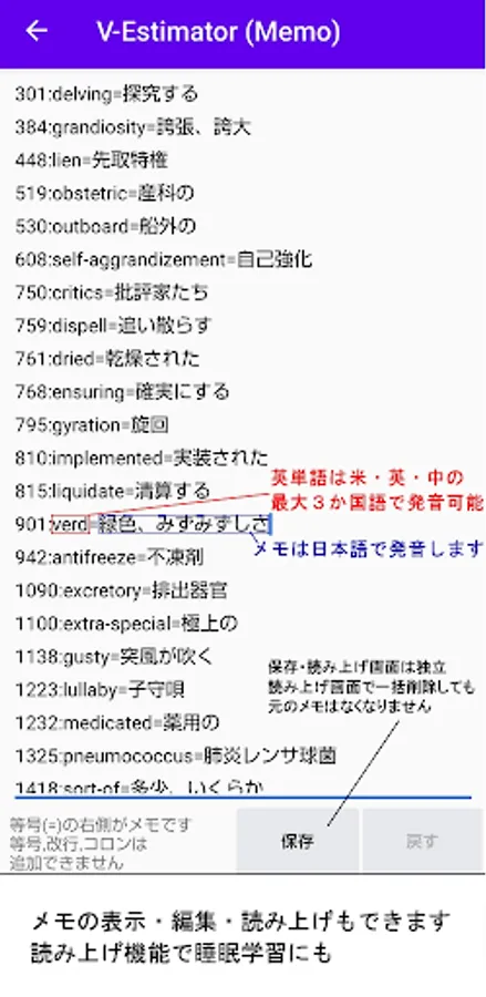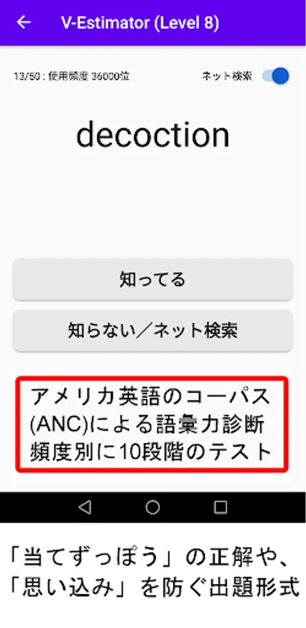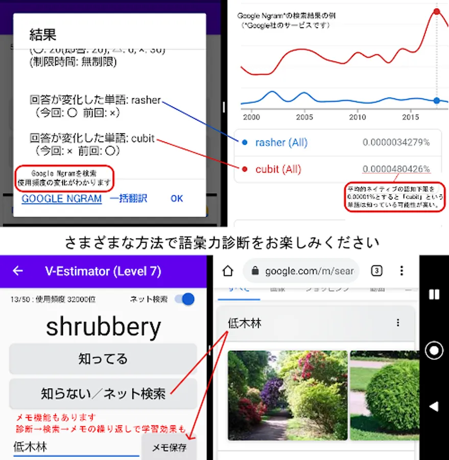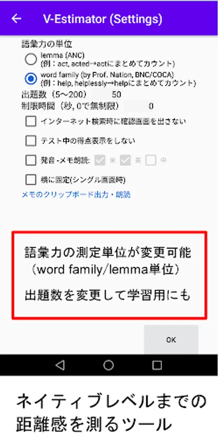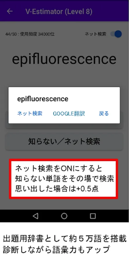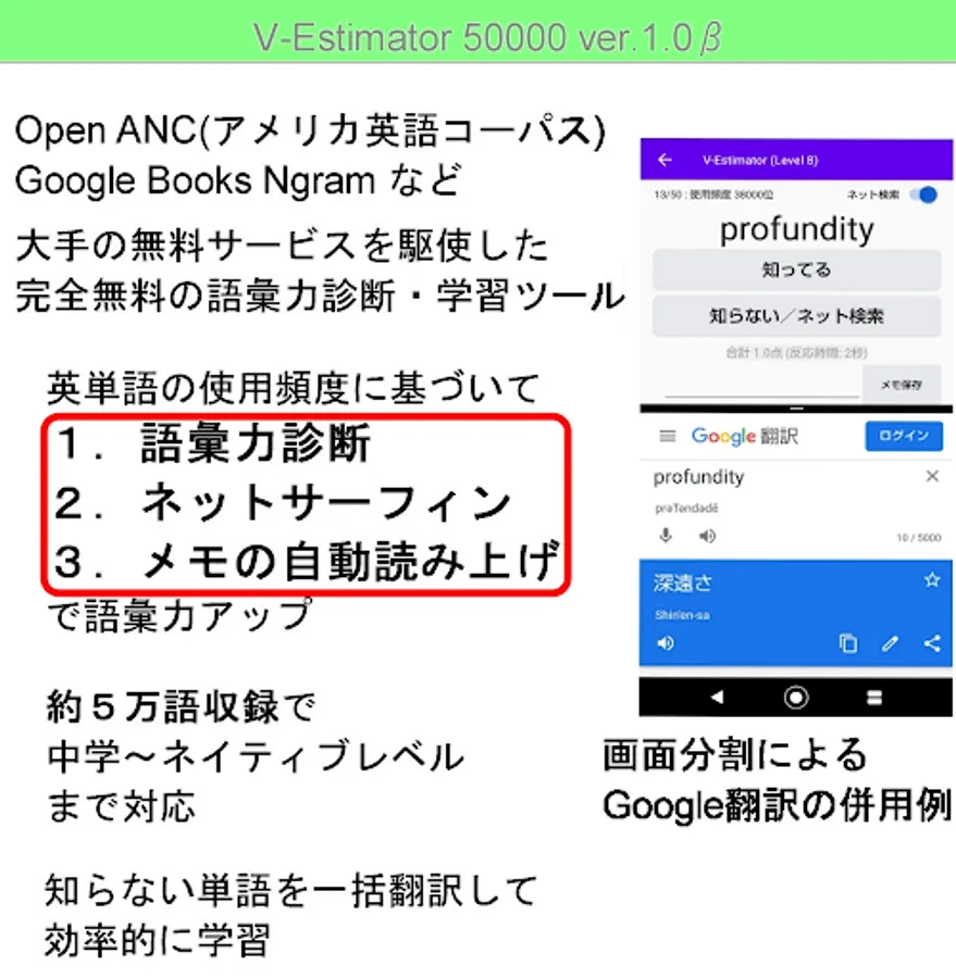 It is possible to learn English words with minimal stress in three stages: vocabulary diagnosis (game) → internet search (net surfing) → memo reading (sleep learning). You can change the number of questions and the time limit, so you can use it for accurate vocabulary diagnosis and learning.