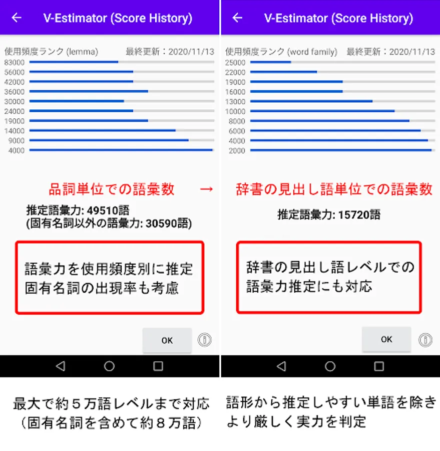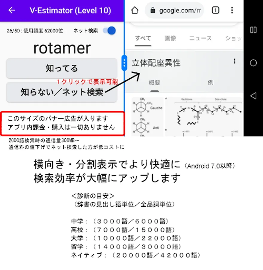 Since paid copyright content is not included in the app, it is free no matter how much you use it. It is an advertising app that only displays one banner at the bottom of the screen, and there is no in-app purchase. In addition, we do not collect any diagnostic results, but users are free to use the app for vocabulary surveys.