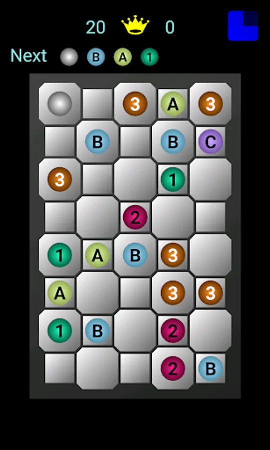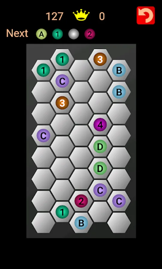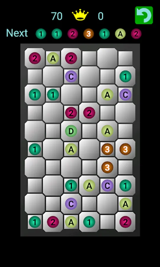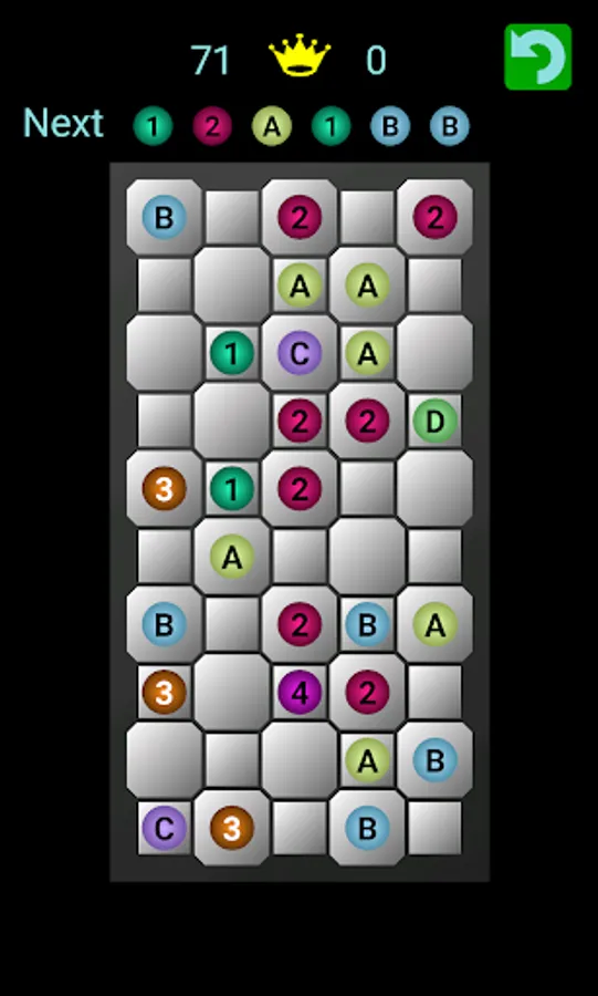 Four neighboring balls with the same number letter will merge to a single, bigger number letter ball.