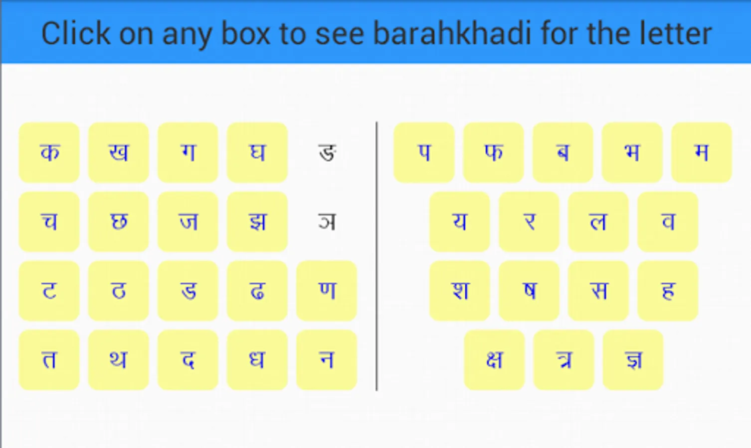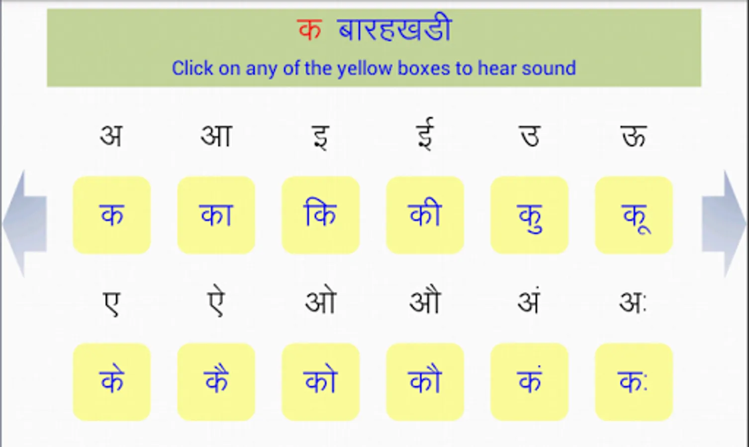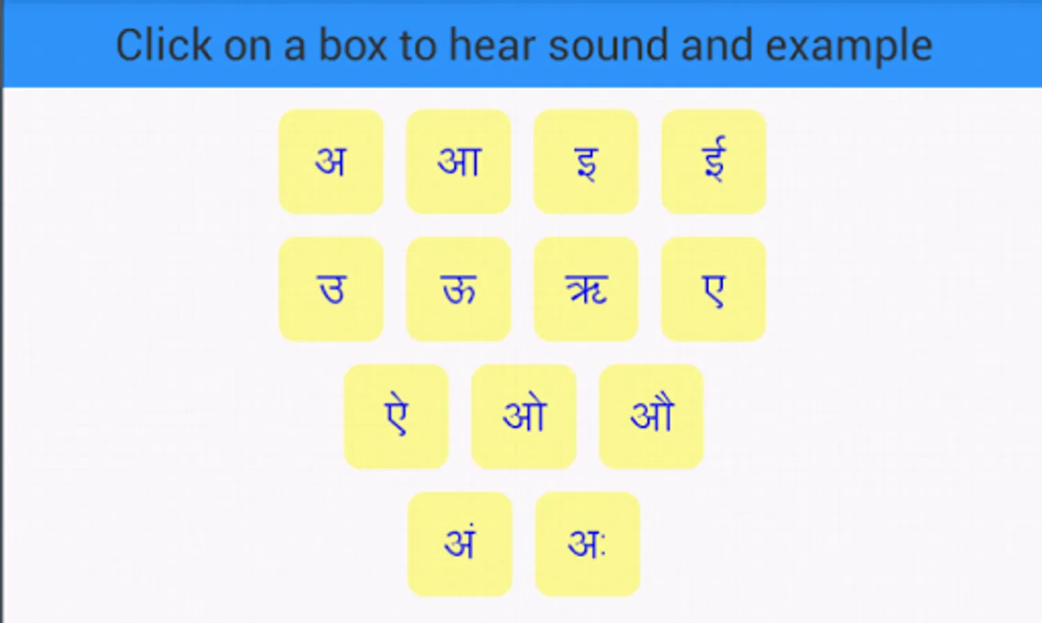 This application is designed for everyone to learn Hindi Varnmala (Alphabets). It contains Swar (Vowels) and Vyanjan (Consonants) sounds with example pictures for every Akshar (Letter).