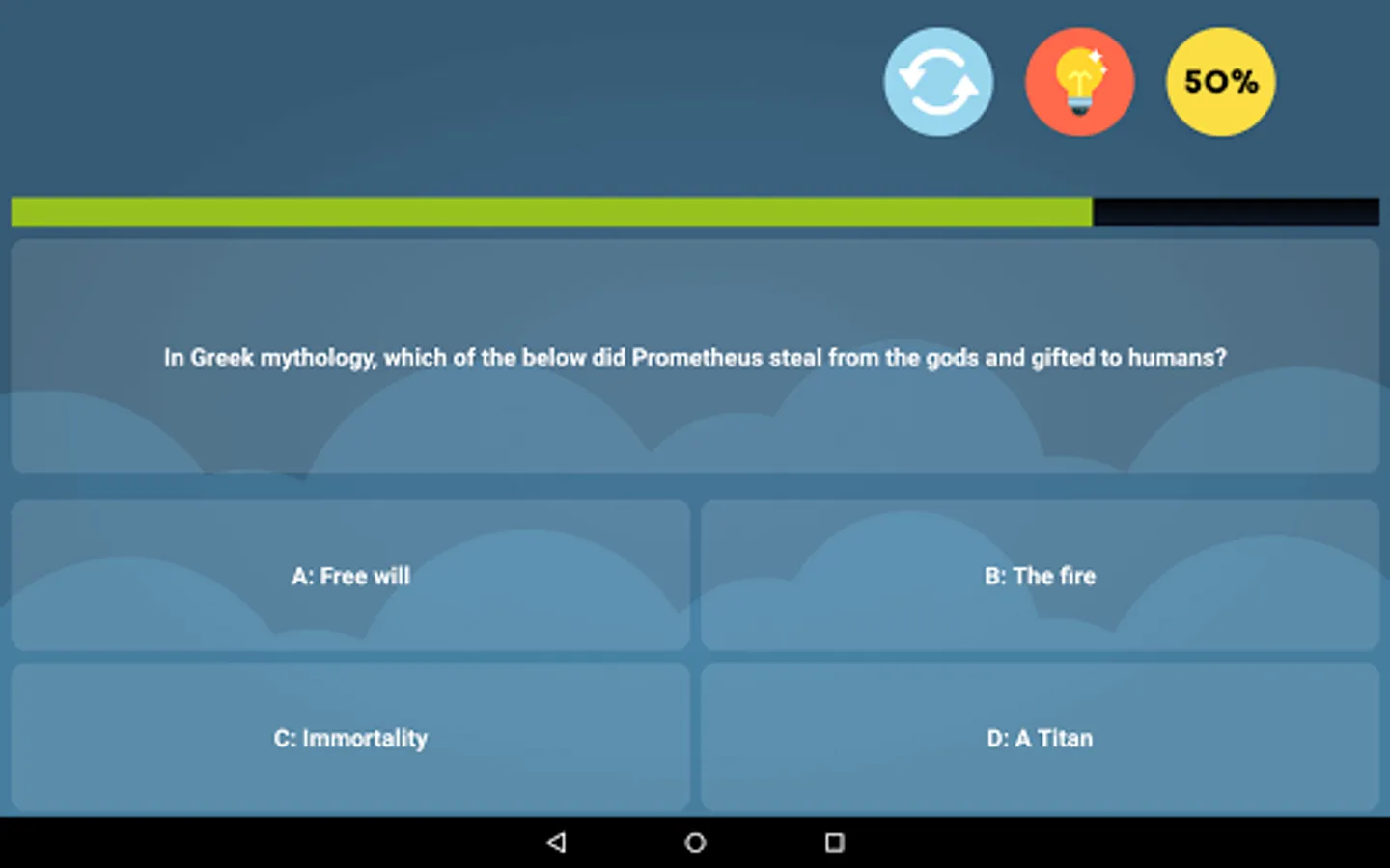 Eureka Quiz Game is the ultimate trivia quiz because it contains more than 5.000 questions that are developed by our team of educators. There are questions about Geography, Sports, mythology, celebrities and so on. There are questions for everyone!