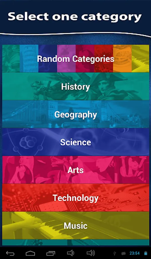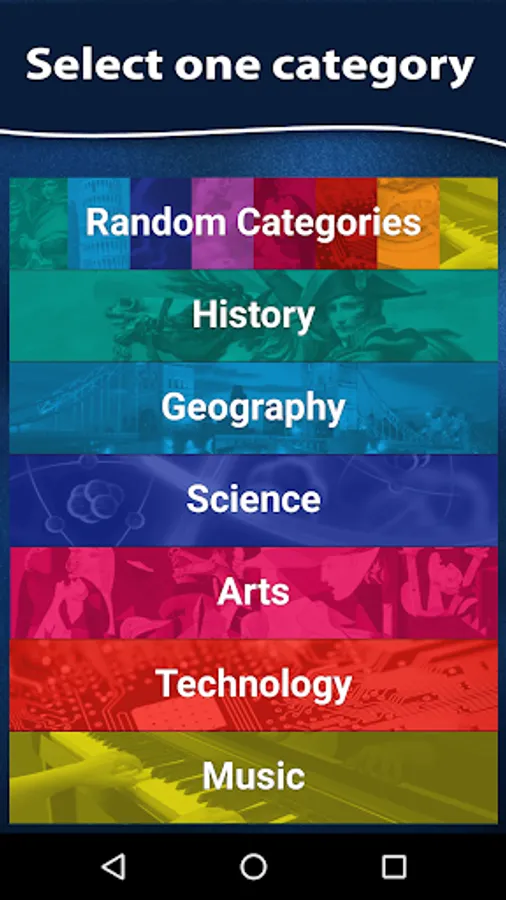 16 categories of knowledge including, history, sports, geography, technology and many more