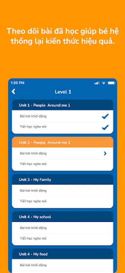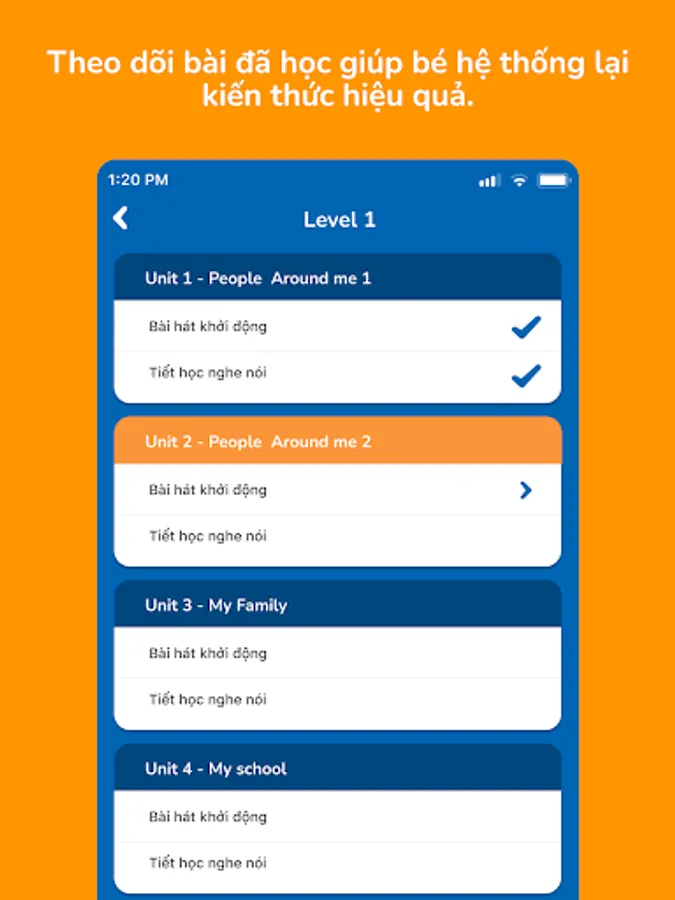 Each Level has songs, listening and speaking lessons, vocabulary, sentence patterns.