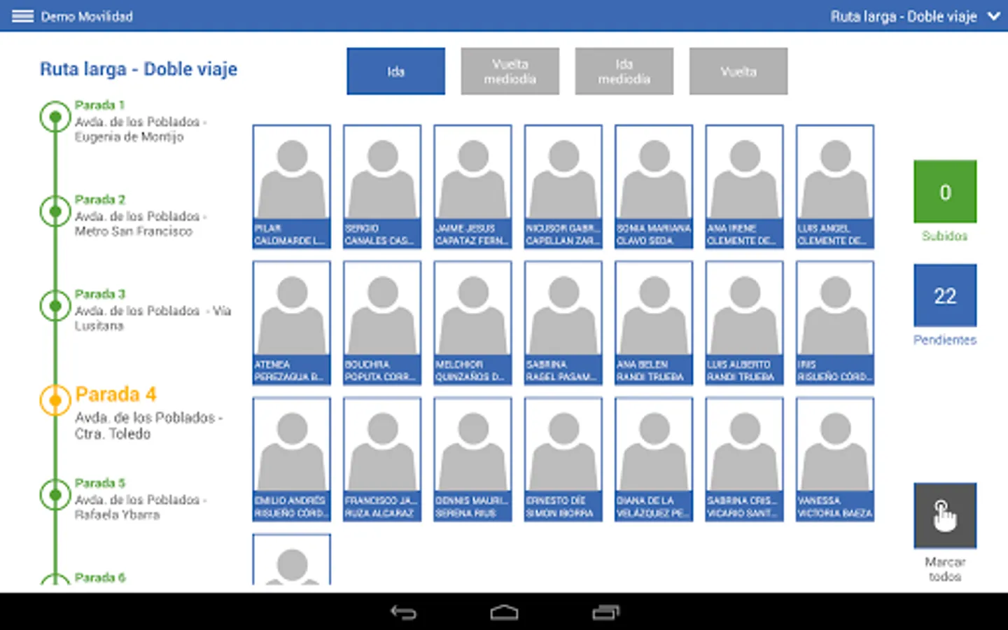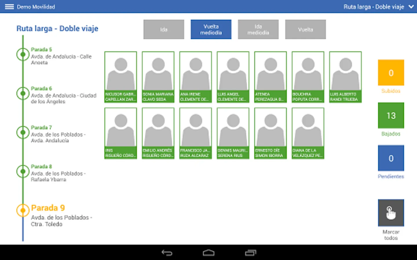At each stop you have information about which users should get on and off the bus. Once you're at a stop can indicate that someone has failed or was not planned and will climb.