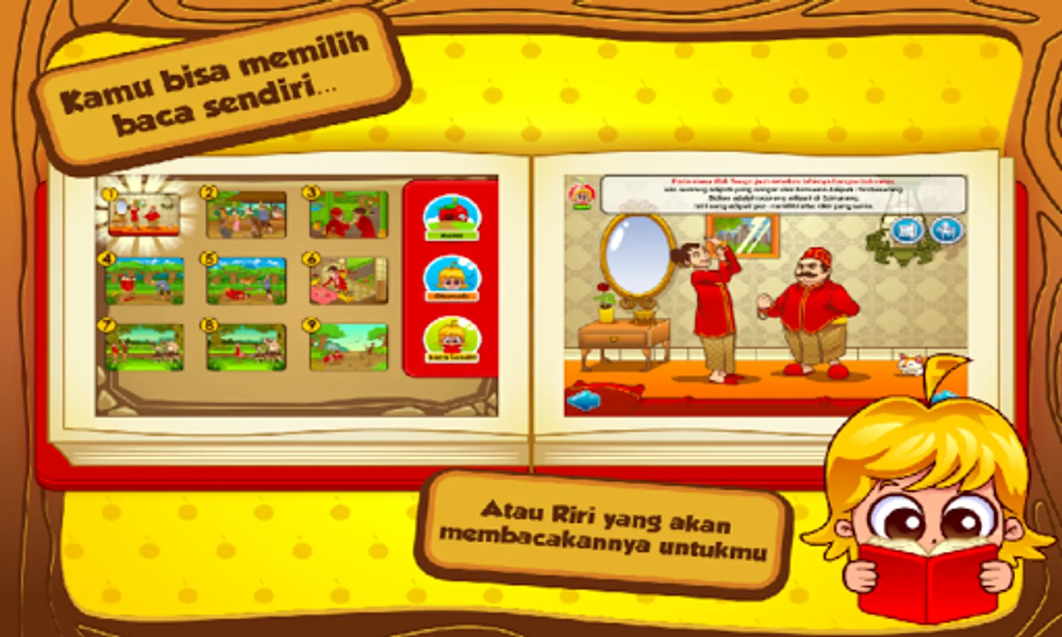 RIRI an interactive children's book series whose theme original folklore of Indonesia as well as Tales and fables from around the world. All this folklore and fairy tales packaged in an interactive, served with Indonesian nuance. This children's book can be used by children who can not read through narration and animation automatically. For children who can read can use the Read Alone mode. In addition to the Interactive Children's Story Book, each series is provided of educational games for children that educates as Colors, Numbers, Numeracy and much more.