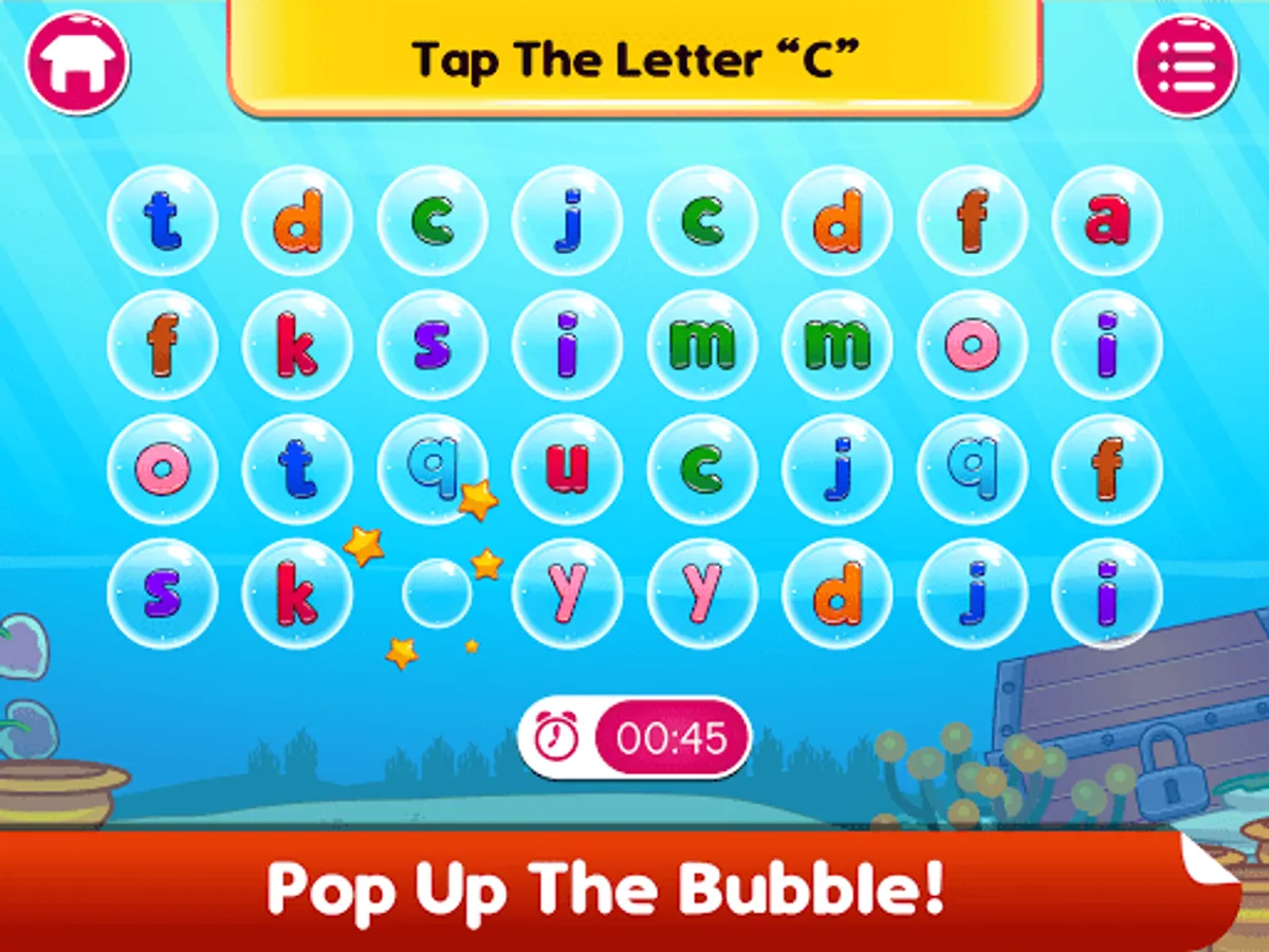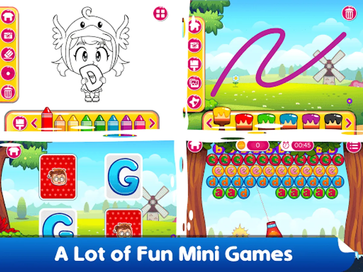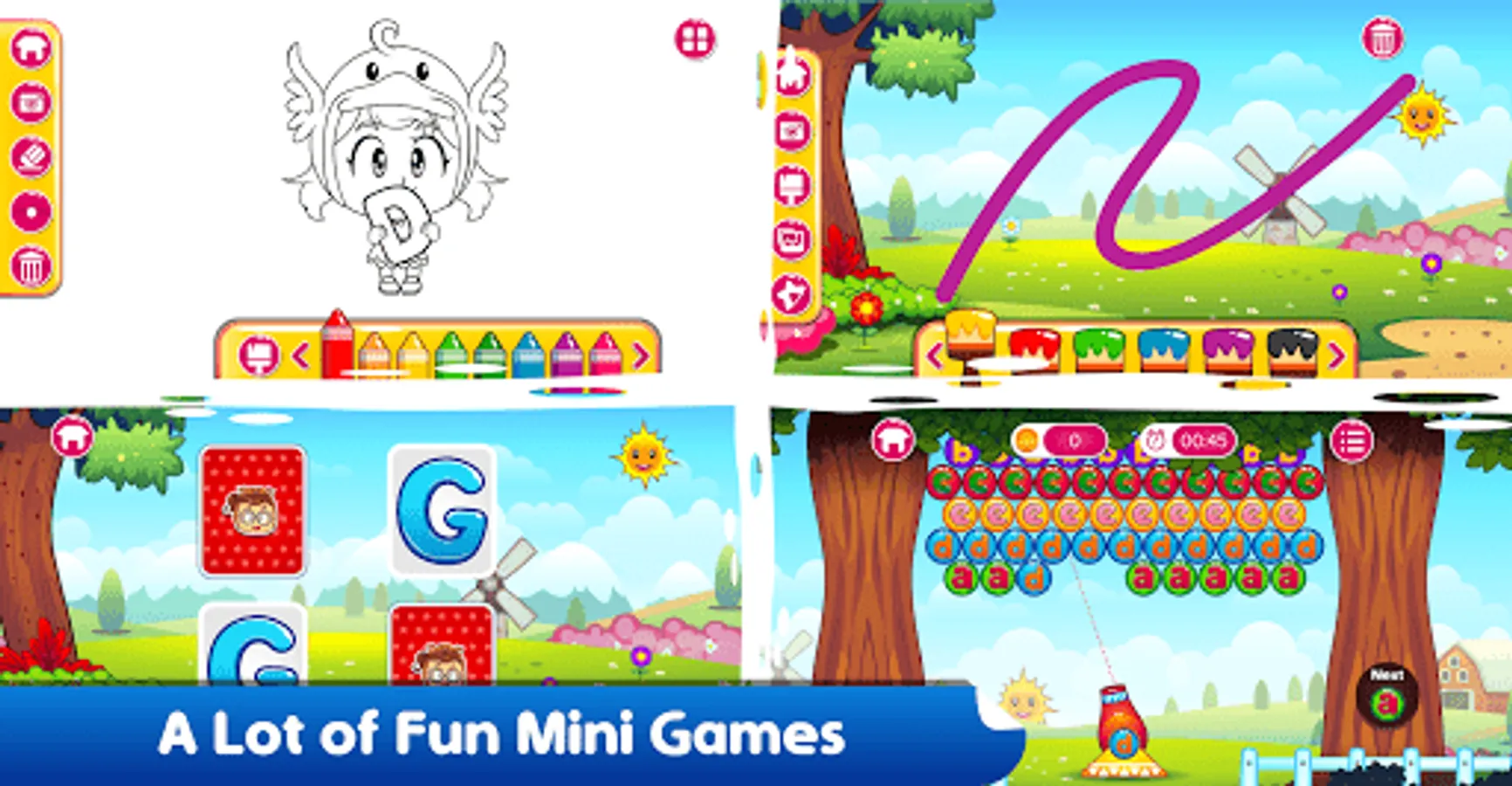> 6 fun and educational mini games including Memory Games, Coloring Books, Sticker Books, Writing Letters, Letter Shoot, and Tap The Bubble.