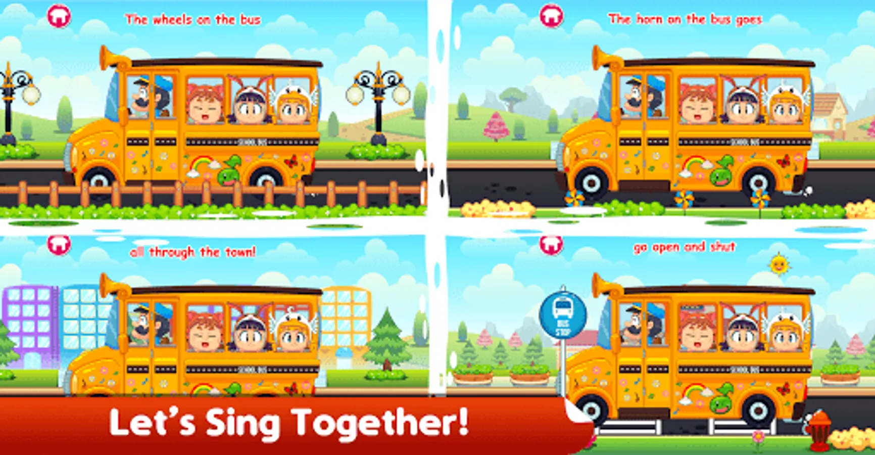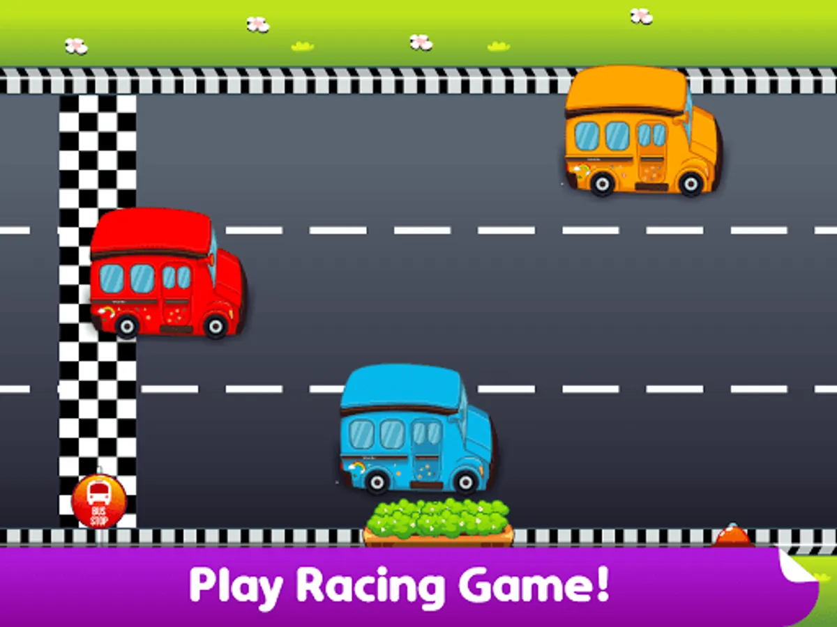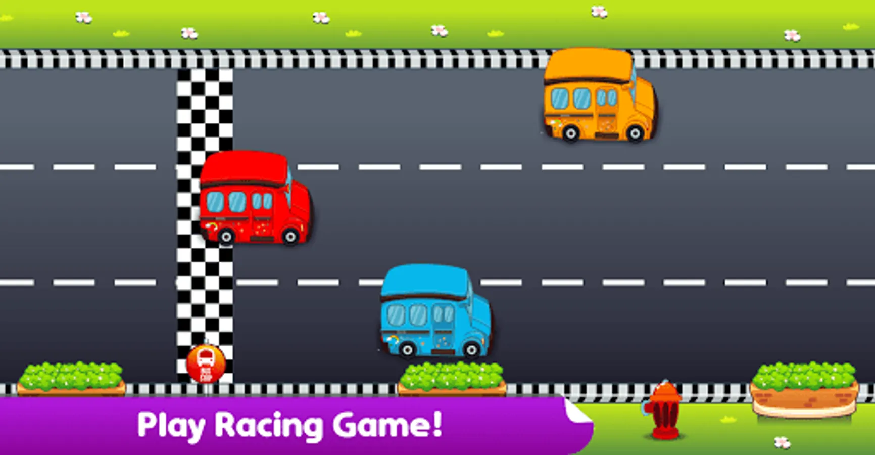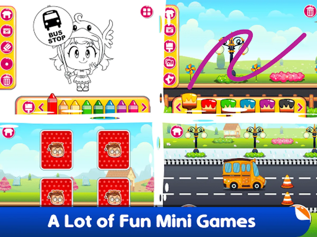 > 6 fun and educational mini games including Memory Games, Coloring Books, Sticker Books, Super Drive, Racing, and School Bus.