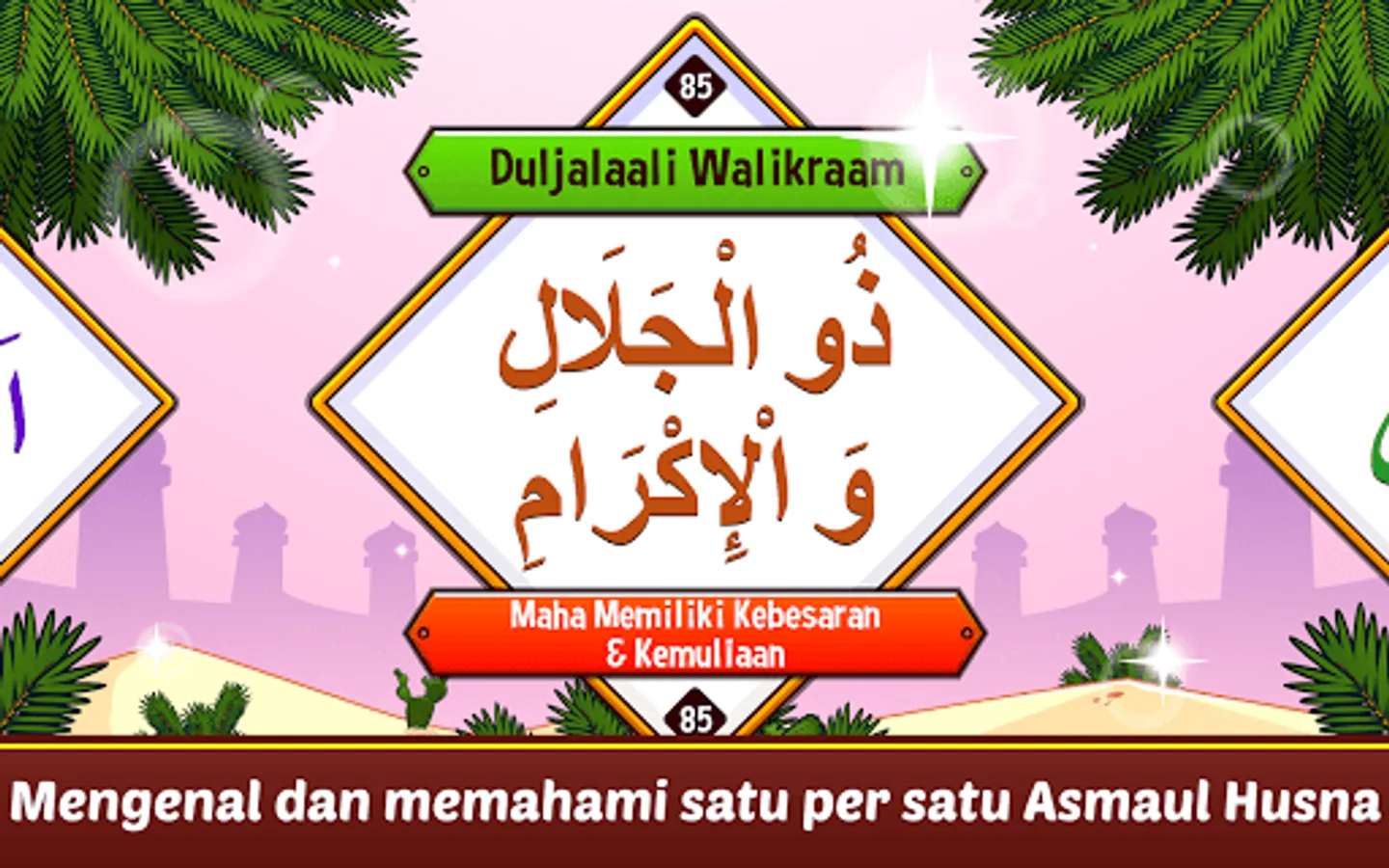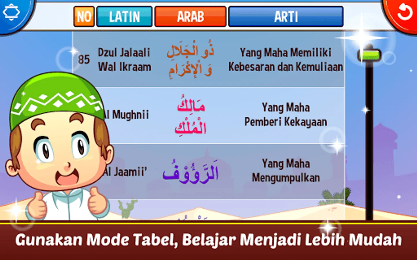 Marbel Beautiful Names is an educational application for children aged 4-8 years. This application helps children to know God's names along with their meaning. The application comes with a supporting narrative that is very beneficial for children who do not yet know how to read. Each is equipped with a narrative material, so that children can learn just by listening to its sound. After they finished studying recognize Beautiful Names / names of Allah, there is a wide range of exciting games await them. Through this game, knowledge and the results of their study could be tested.