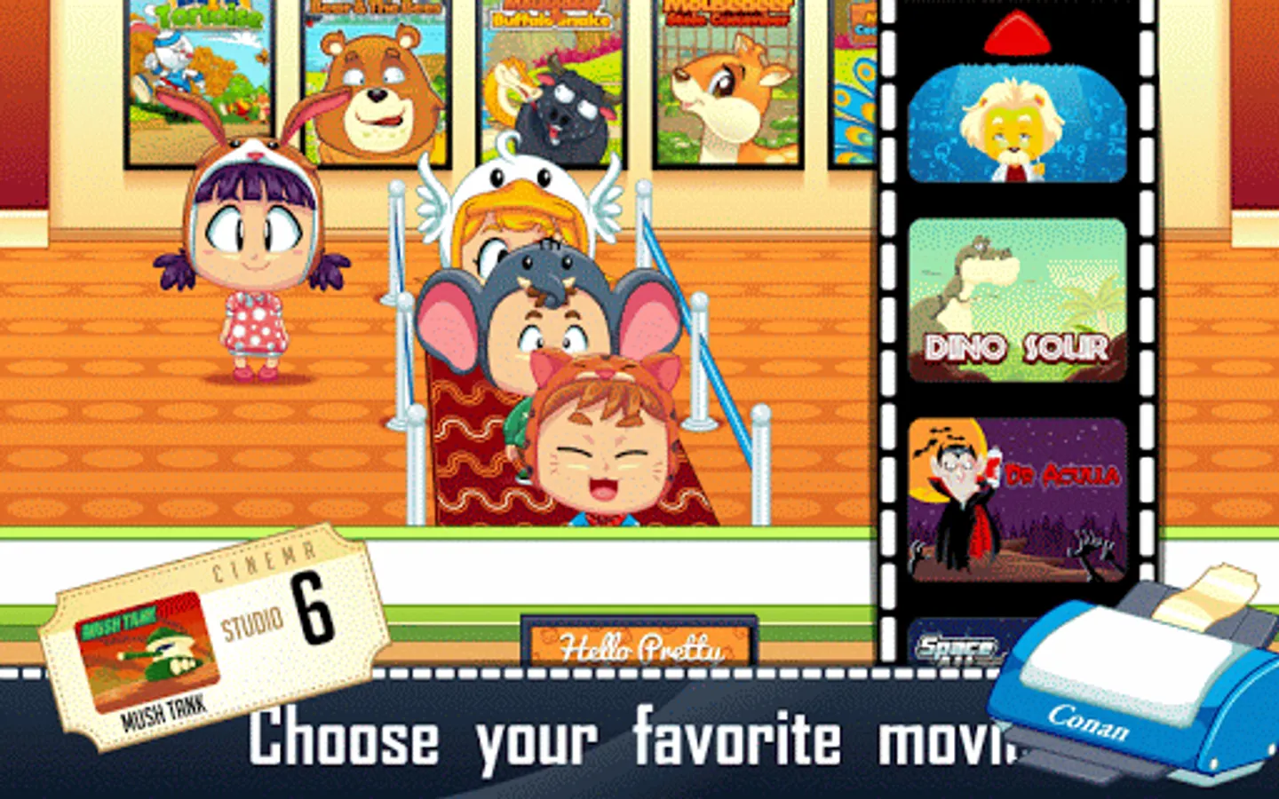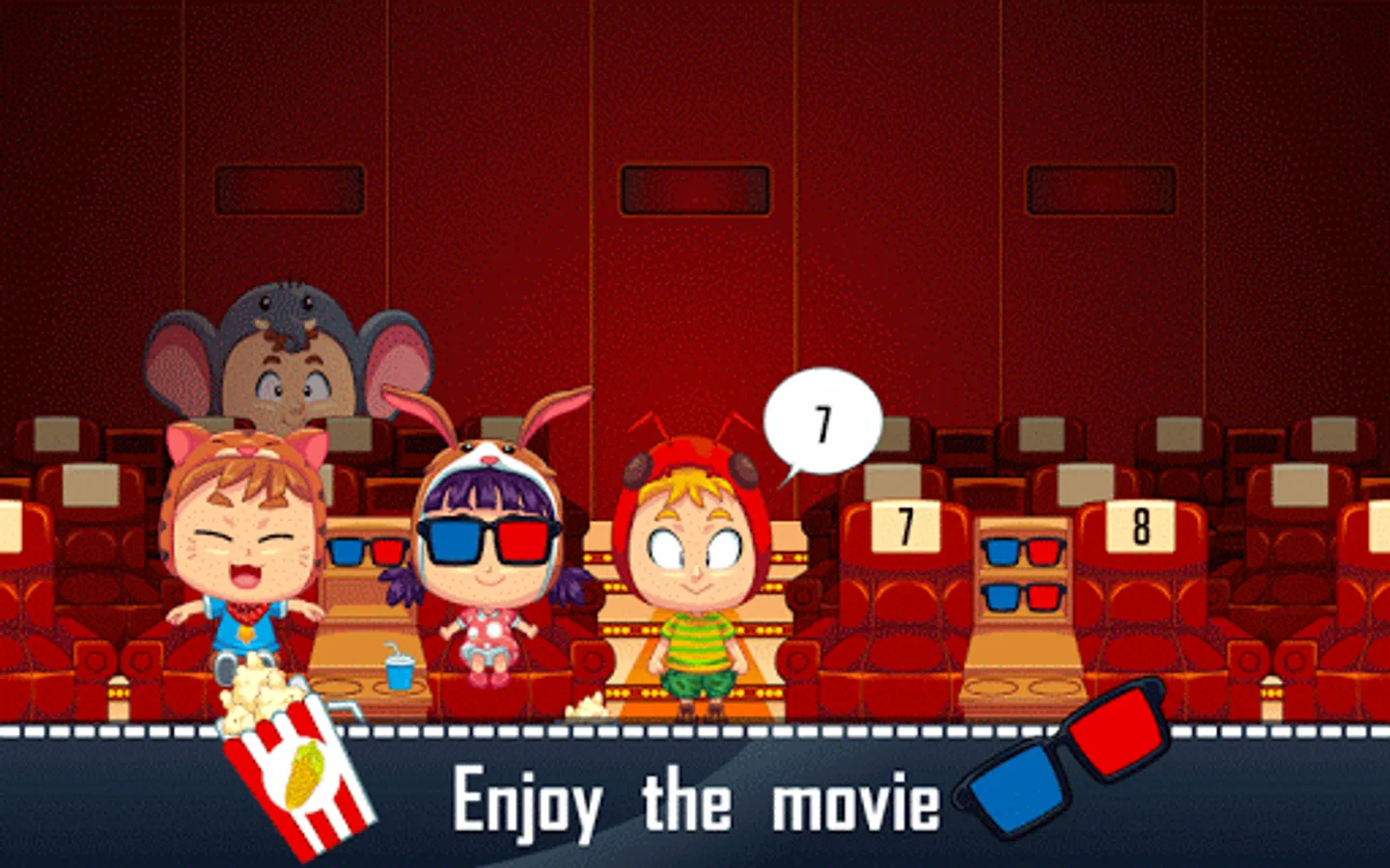 Do you like watching a movie? Let's go to the cinema with Marbel! You may choose your favorite movie, buy a pop corn, watch 3D movie using 3D glasses.