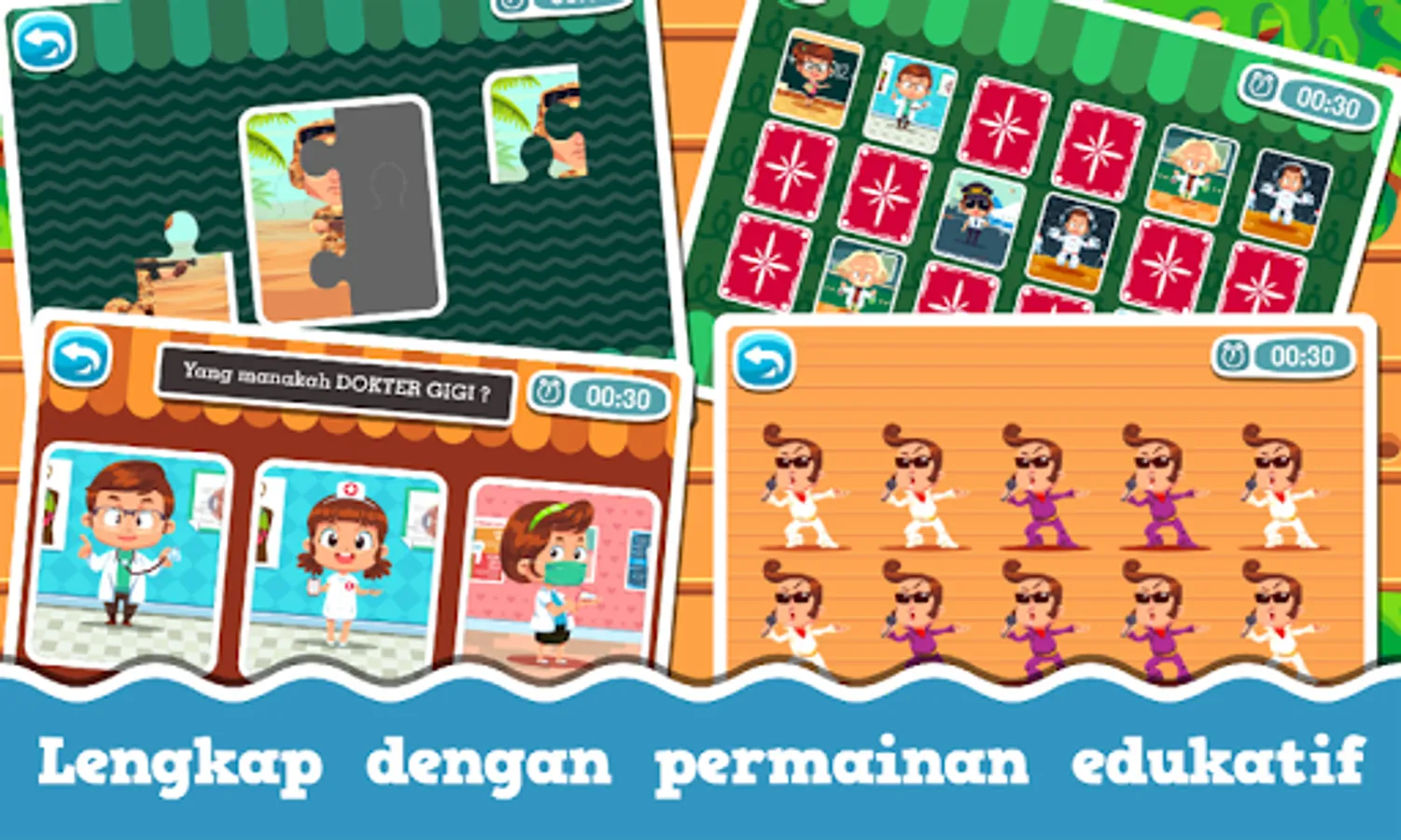Complete! Children can learn more than 15 types of professions that are around. Equipped with animation and voice narration so that children can understand each explanation well!