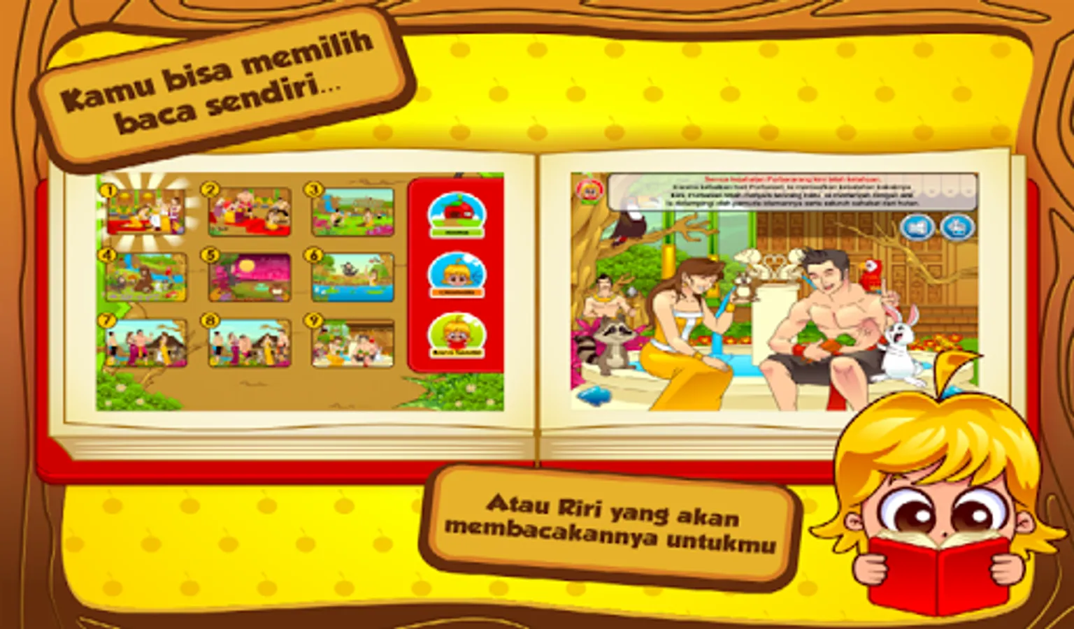 RIRI an interactive children's book series whose theme original folklore of Indonesia as well as Tales and fables from around the world. All this folklore and fairy tales packaged in an interactive, served with Indonesian nuance. This children's book can be used by children who can not read through narration and animation automatically. For children who can read can use the Read Alone mode. In addition to the Interactive Children's Story Book, each series is provided of educational games for children that educates as Colors, Numbers, Numeracy and much more.