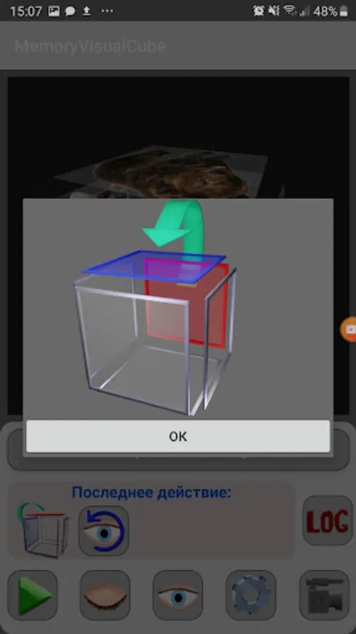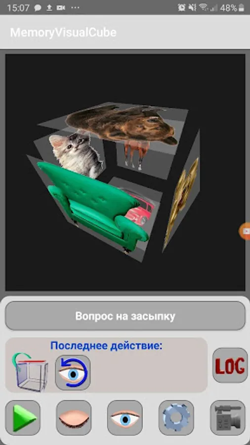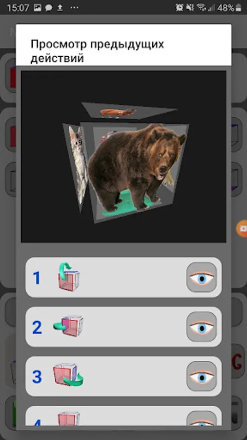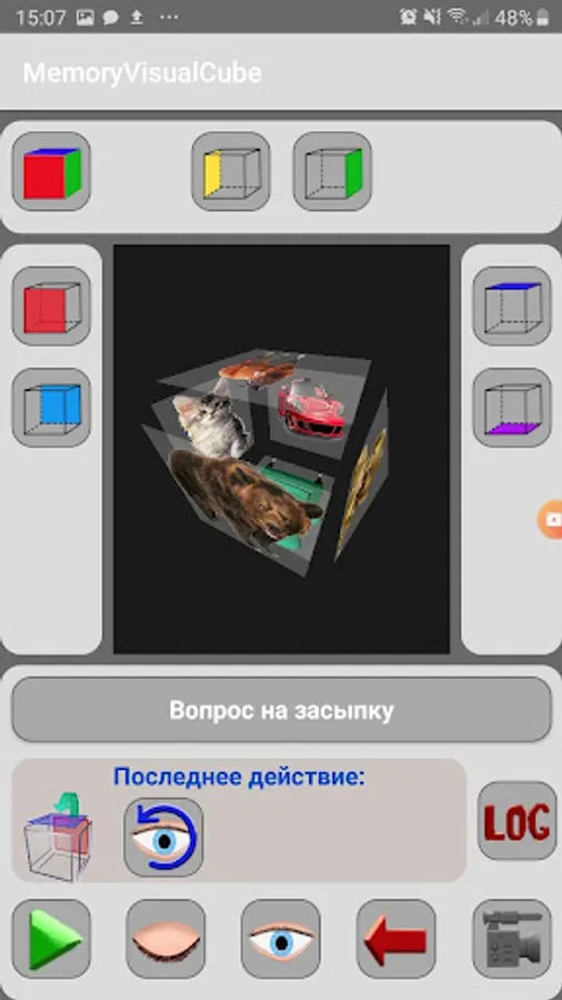 When all the faces of the cube are ready, we try to remember the location of each picture. When ready, hide the cube and when you press the "Next operation" button, an image with the next rotation of the cube will appear on the screen.
