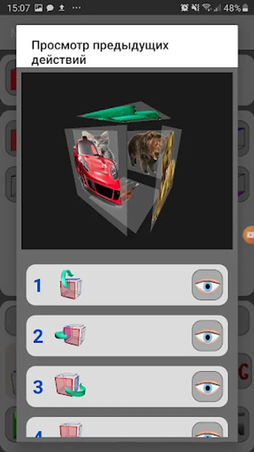If you get confused or confused, at any time you can return the cube to the screen and check the real arrangement of the faces. It is also possible to view the history of all actions with the cube, in order to better understand how we arrived at the current result and where we could get lost