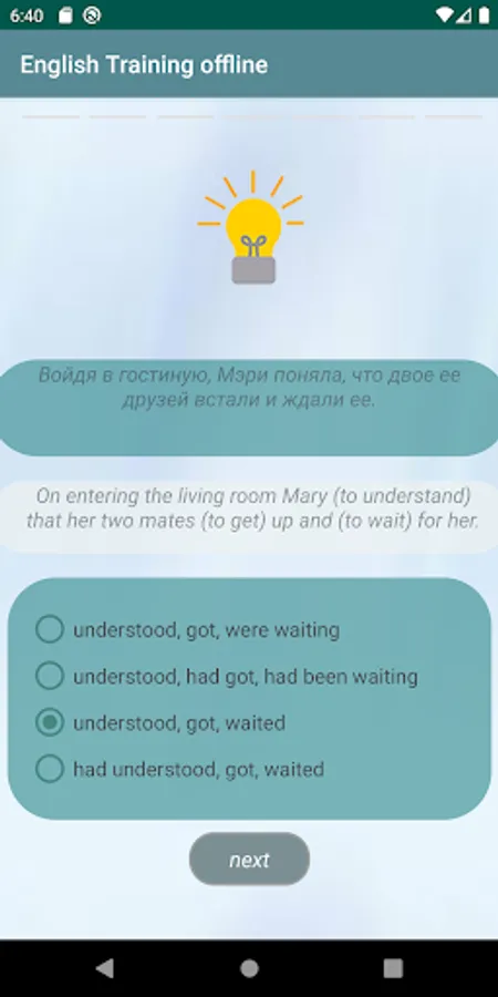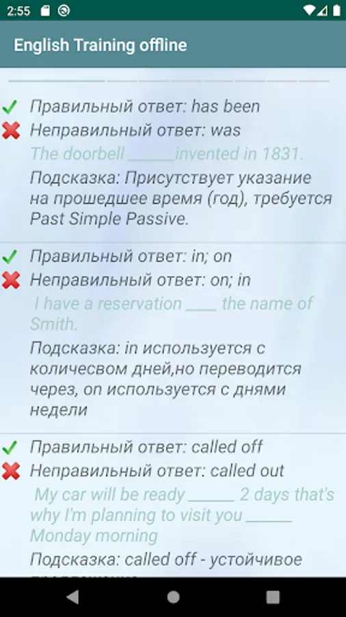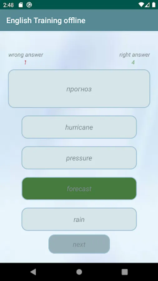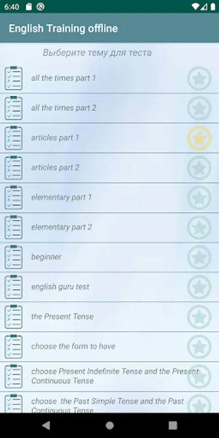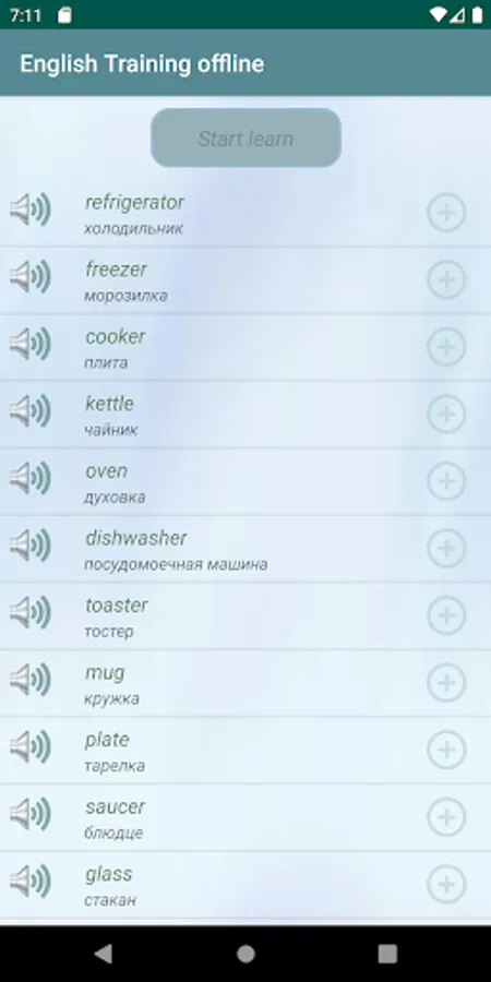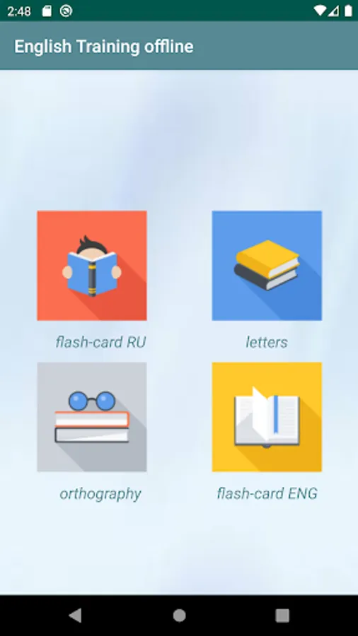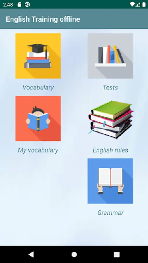 This application will help you learn English without the Internet, that is, offline. Here you can find the rules for selected topics, tests for topics with translation, the grammar will train you to make sentences from words, as in English there is a more precise word order and your personal dictionary where you can add words that you want to learn. The dictionary contains a list of words by topic, you can study the words using the following sections: