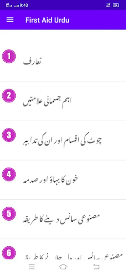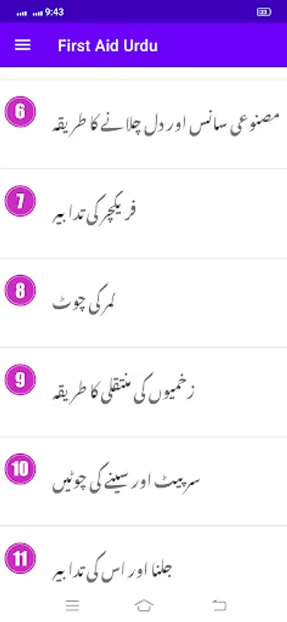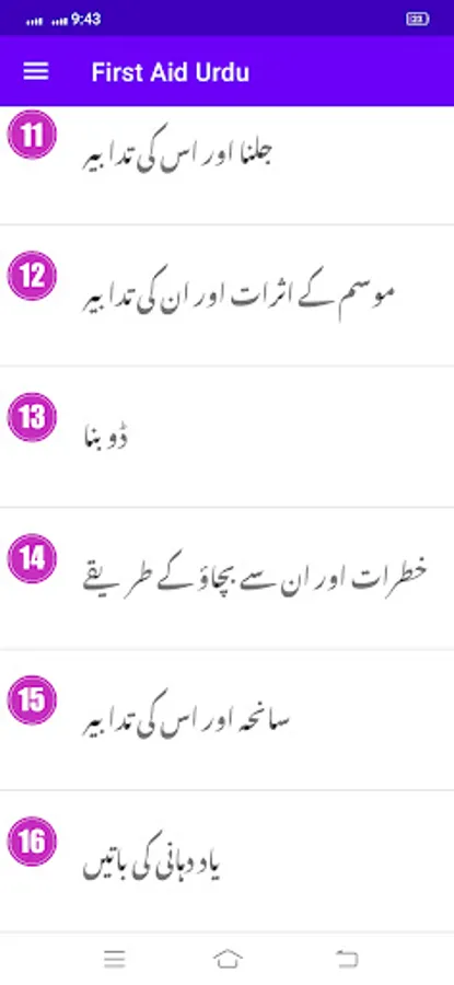 First Aid is app to help an individual to handle the accidental situation in an efficient manner. It helps to overcome any situation that is making a pain to affected person. It will be able to get relief to affected person. 1st Aid Urdu app can be used to get guidance about disaster management, artificial breathing, heart running, healing a wound, wrapping a bandage on wounds.
