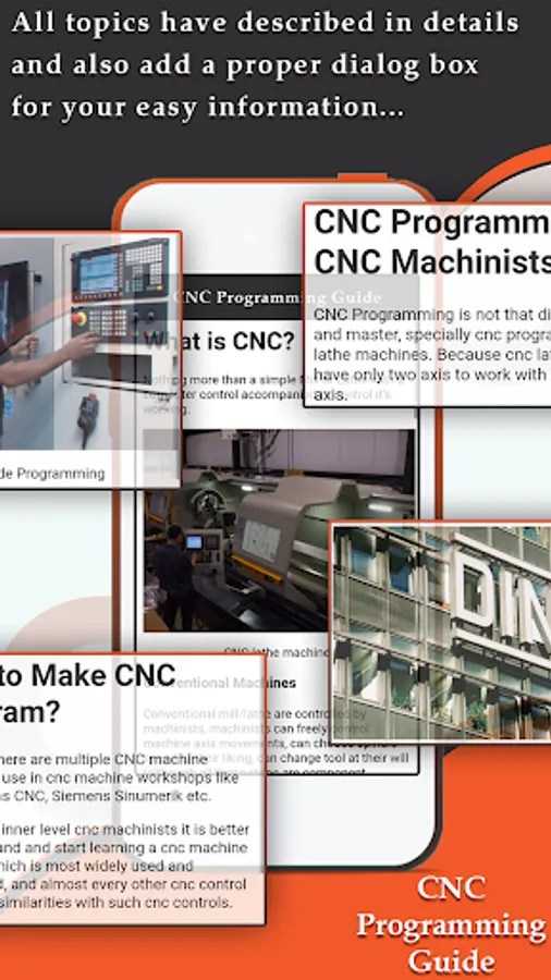 CNC Programming app is also integrated for common CNC Programming formulas, and It provides learning information about CNC Programming.