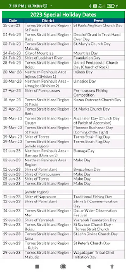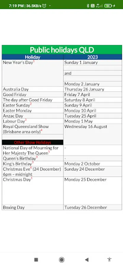 This app contains a calendar of all 2023 public holidays for Queensland. These dates may be modified as official changes are announced, so please check back regularly for updates.