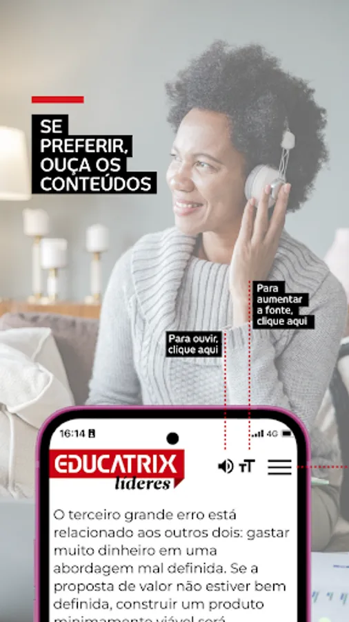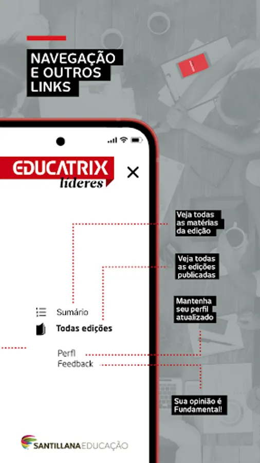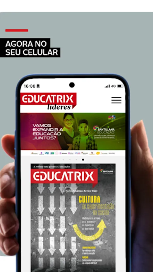 The Educatrix Líderes app is the digital version of the Santillana Educação magazine, designed for the Brazilian school manager. Now you can consume content wherever and however you prefer. Adjust the text size, listen to the stories, watch videos that complement the content and much more.