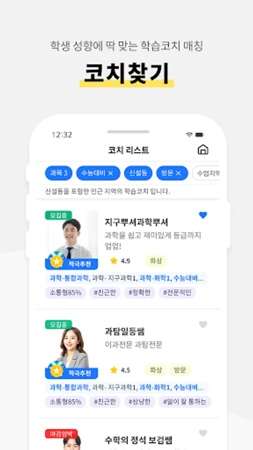 Not just teaching subjects, but “formation of empathy”, “changes”, “correction of wrong answers”, “management of adolescent emotions”, “rapid grade improvement”, “middle test”, “regular parent counseling”, “careers” Settings”, “Self-directed study method”, “Planner writing method”, “Coach’s academic background and experience”, “Student respect attitude”, etc. If you check what you want, the learning coach will coach you along with the subject!