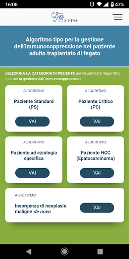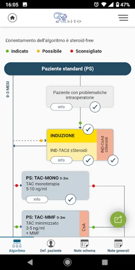 An interactive tool, developed by the Italian Society of Organ and Tissue Transplants, for consulting the "Typical algorithm for the management of immunosuppression in the adult liver transplant patient" with the aim of providing the basic elements and food for thought to guide the therapeutic choice.