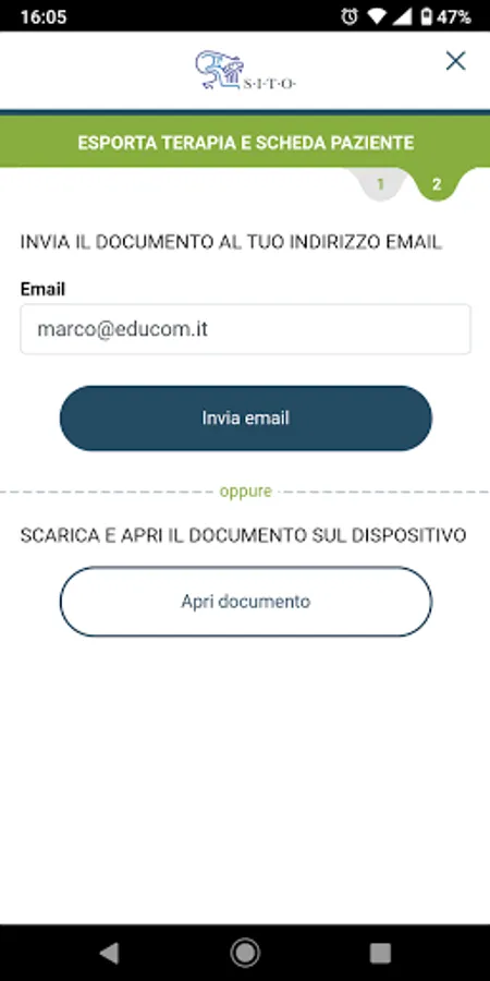 The tool allows you to consult different therapeutic schemes based on the type of patient and to export the selected therapy and the general characteristics of the patient, to be able to archive and consult them later. The export can be done by sending an email or by archiving on your smartphone.