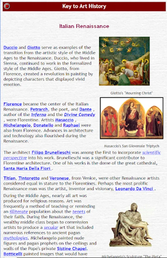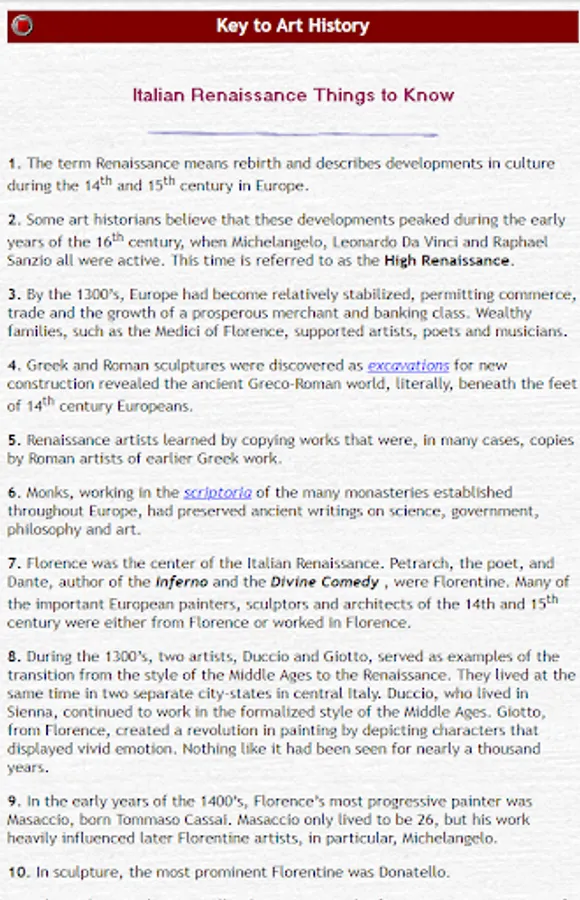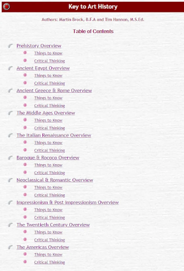 The Key to Art History includes information about the movements in art for the various time periods and cultures throughout the history of Western Civilization. Throughout the text are inks to art museums, galleries, artists' profiles and other web sites around the world with more information about the artists and examples of their work.