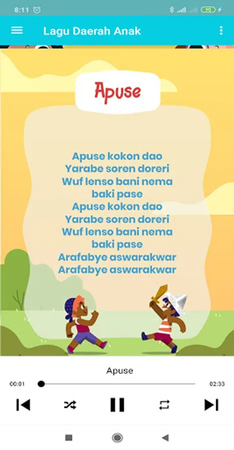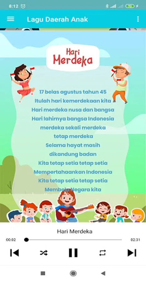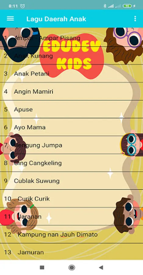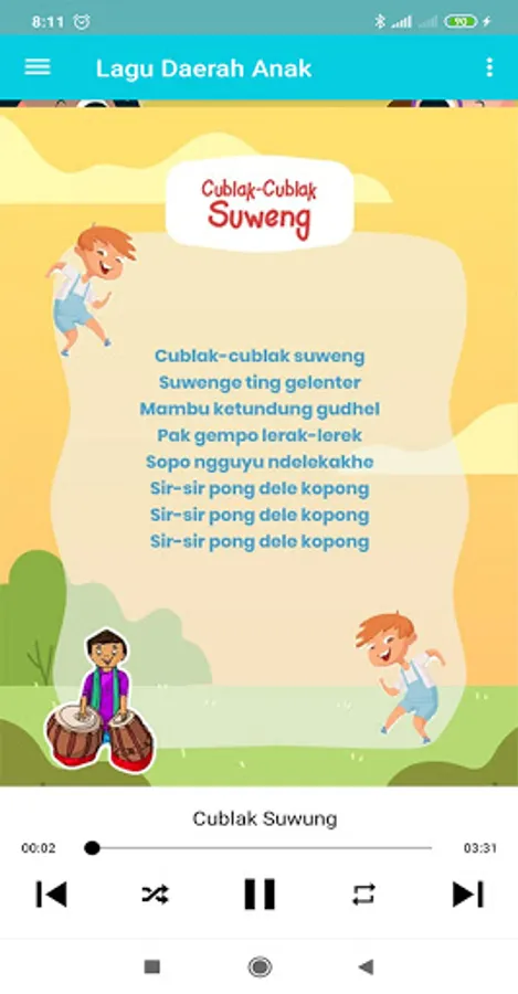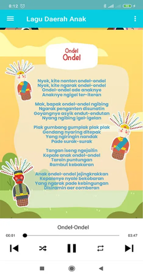 With this educational application it can help our children in learning Indonesian regional and national songs, in this application not only songs but also song lyrics, animations and interesting backgrounds, as for the songs, among others: