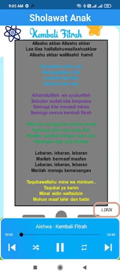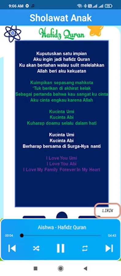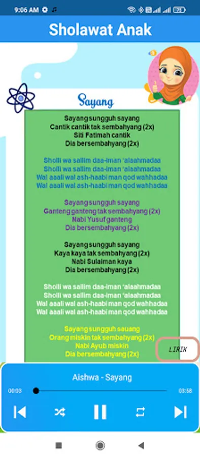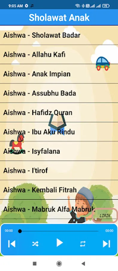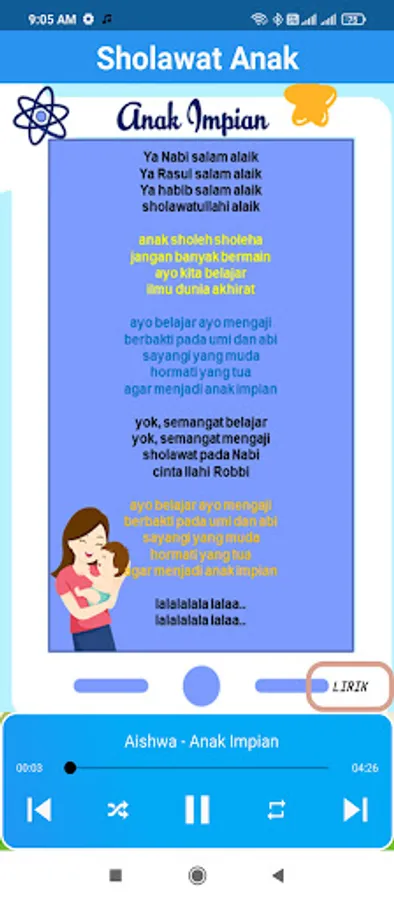 This Offline Children's Sholawat contains sholawat and Islamic songs for children, this educational application is equipped with song lyrics, melodious audio and is 100% Offline and Free.
