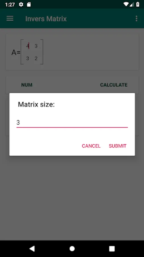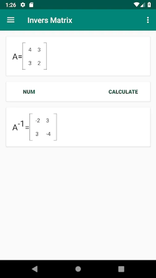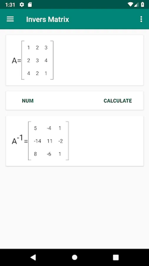 Invers Matrix is one of math calculator app. This app help user to calculate the inverse of square matrix with Gauss-Jordan elimination. With single click, the inverse result will be available in bottom of matrix.