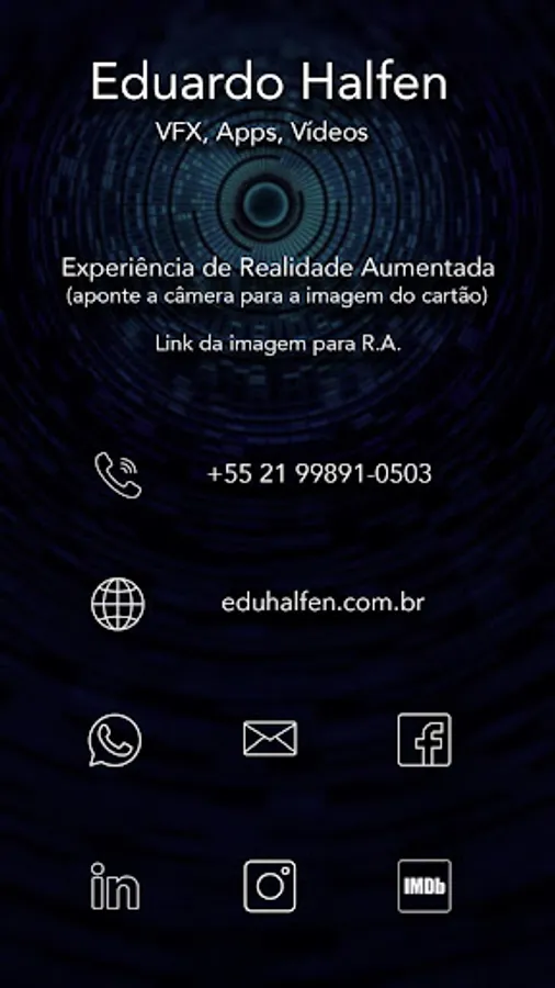 Here you will get the contact links of Eduardo Halfen, expert in VFX (Visual Effects), Video Production and Apps Development. Also includes an Augmented Reality experience with your business card.