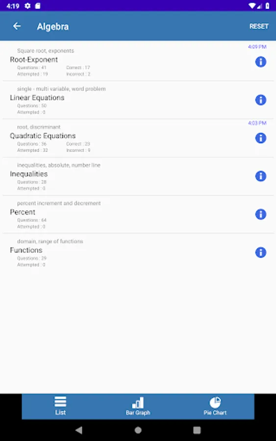 The hierarchal and intuitive arrangement of Question, Flashcards and Timed Tests gives an un-cluttering experience. Progress and performance tracking data/graphs are visible at every step.