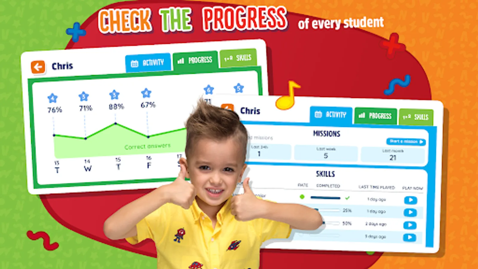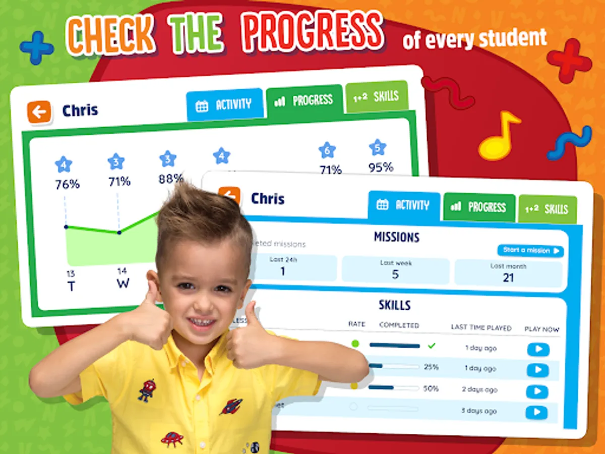 Your children will develop their intelligence while having fun with Vlad and Niki and you will be able to check their progress in math. The application offers a specific section with statistics and graphs so that parents or guardians can visualize the student's development, as well as identify mathematics content with points of improvement or with the highest number of errors. In this way, children can reinforce the areas where they encounter greater difficulty.