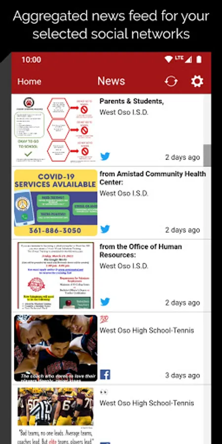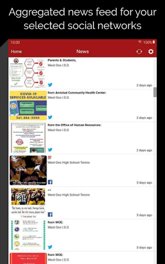 Stay informed of school announcements, activities and events at West Oso Independent School District. Select your preferred list of school social media accounts and monitor school information from many popular social networks. Transfer any activity or event directly to your Android calendar with a single tap.
