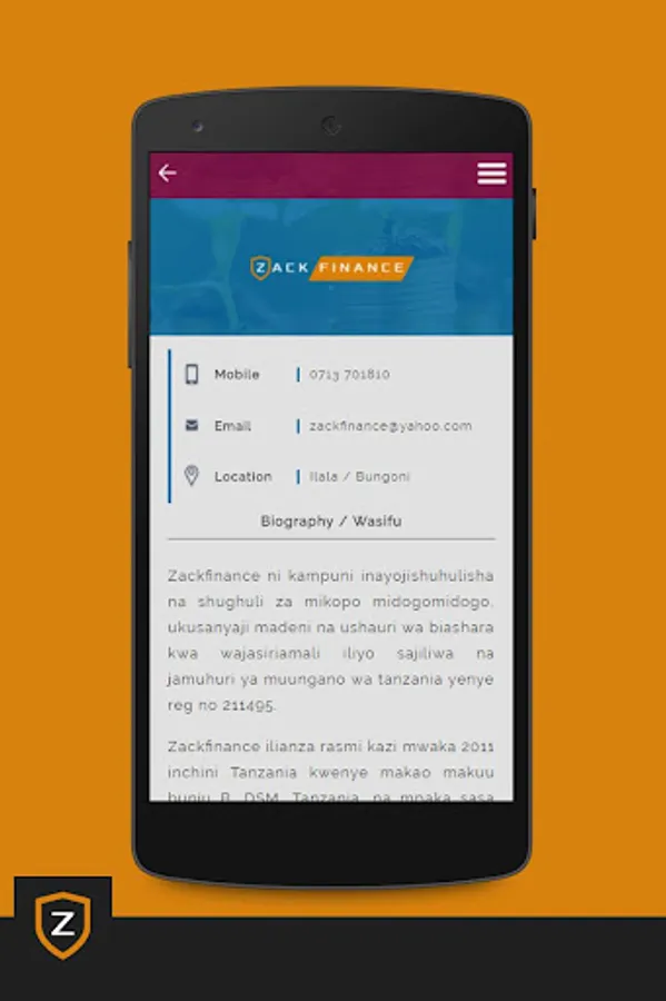 Zackfinance ni kampuni inayojishuhulisha na shughuli za mikopo midogomidogo, ukusanyaji madeni na ushauri wa biashara kwa wajasiriamali iliyo sajiliwa na jamuhuri ya muungano wa tanzania yenye reg no 211495.