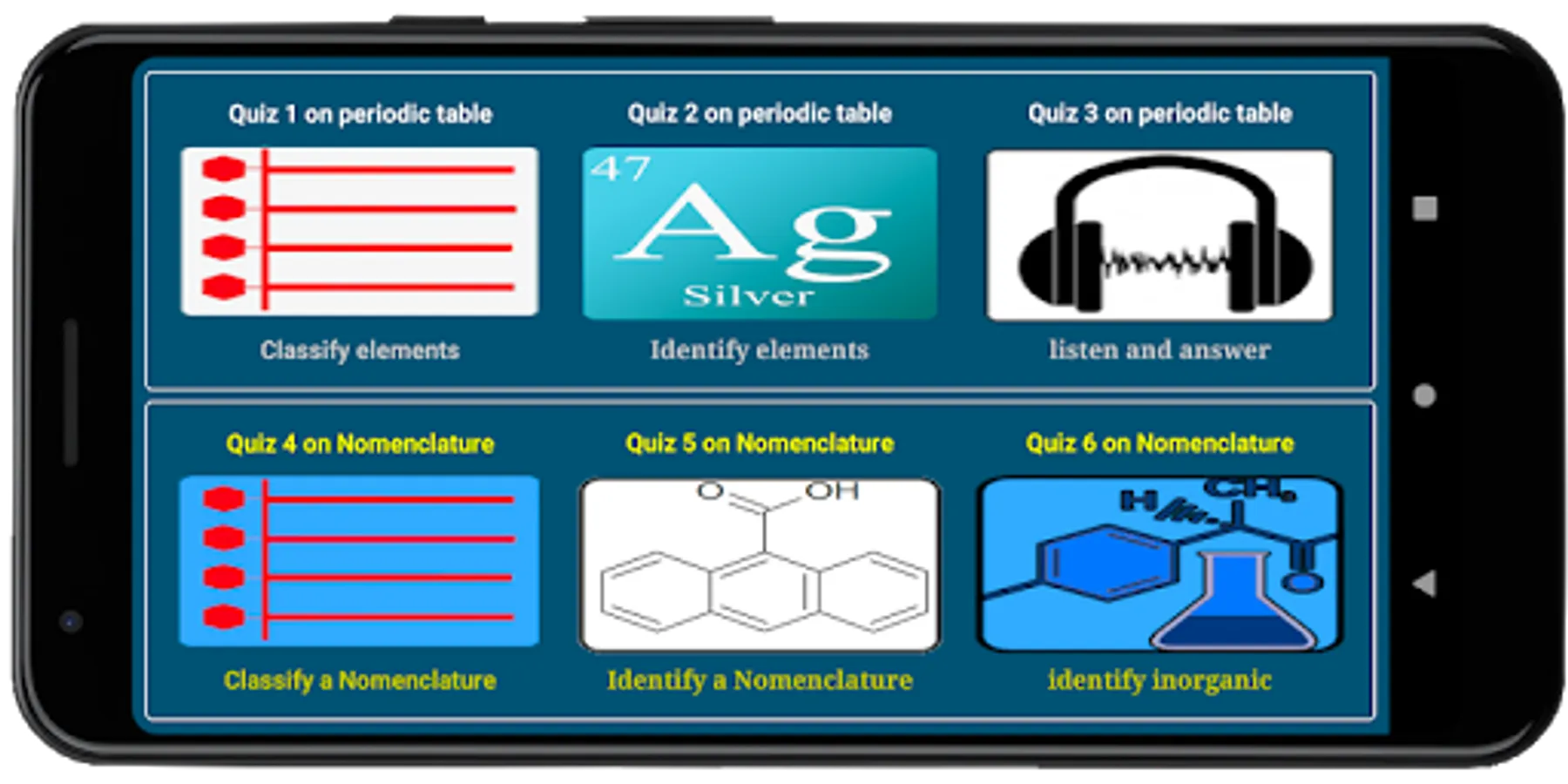 - Application features : (Elements names, elements formulas, simple quiz on elements)