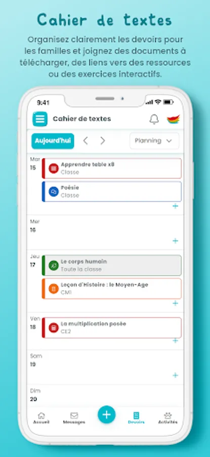 * At a glance, view the homework you have scheduled, the events you have shared and the messages exchanged with parents.