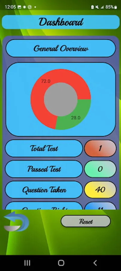 A Statistics section that help the user to keep track of all the statistics such as general score, number of questions taken, number of tests taken, and much more.