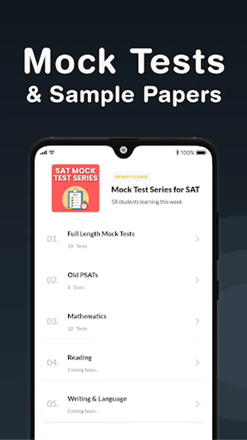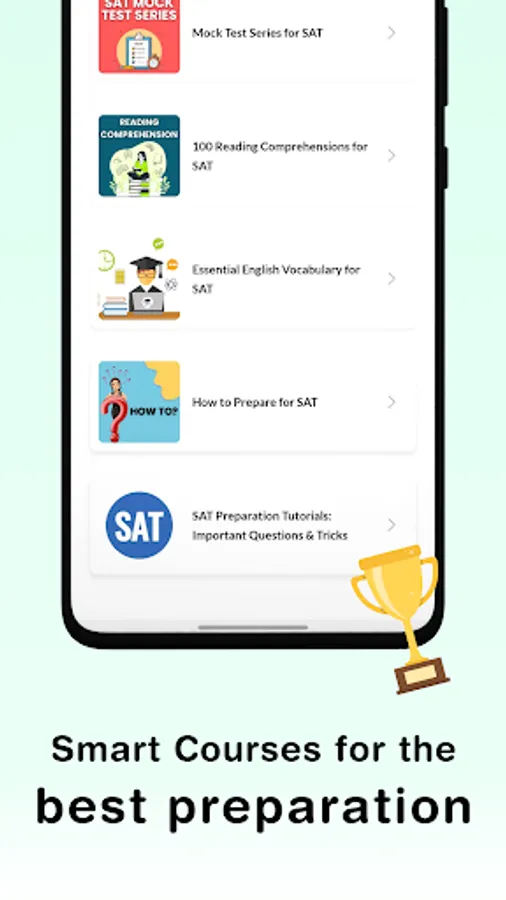 "SAT Practice Test & Exam Prep" App provides preparation study material, Short Notes of all subjects, Question BANK, Practice tests, previous year papers Online Tests, Topic Wise Tests, Daily insights, English vocabulary, Previous year question papers and Important tips & tricks.