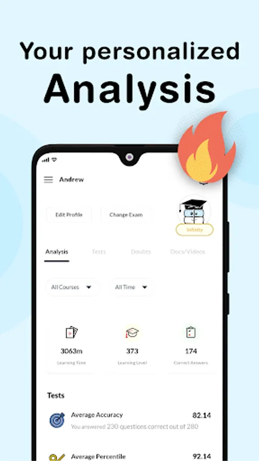 App learns about you while you learn from the app & tracks study pattern to give content/tests as per your need