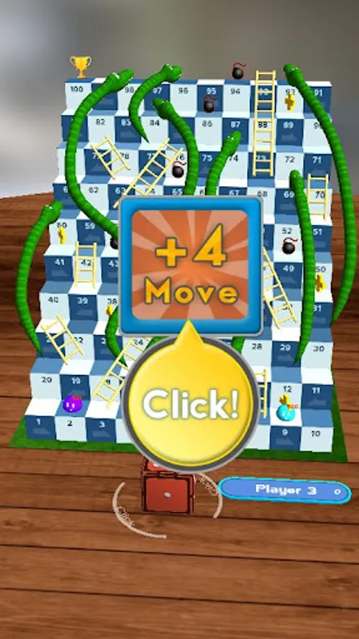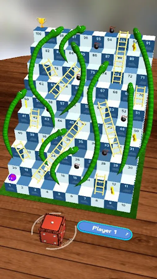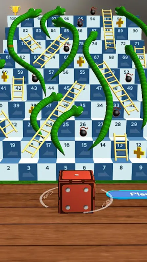 The first person to reach the 100th level is the winner, avoiding snakes and bombs.