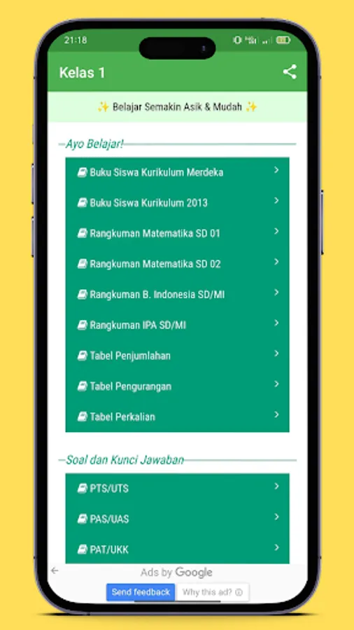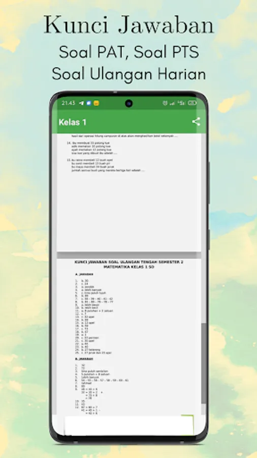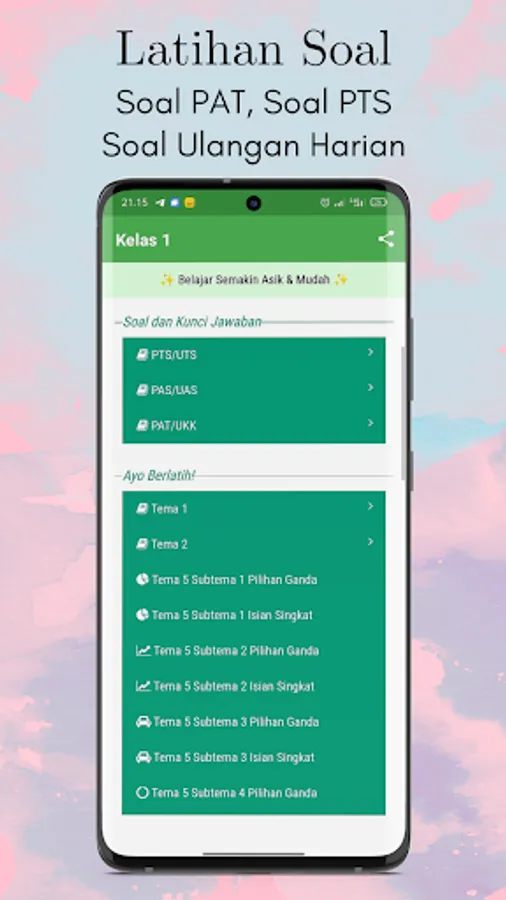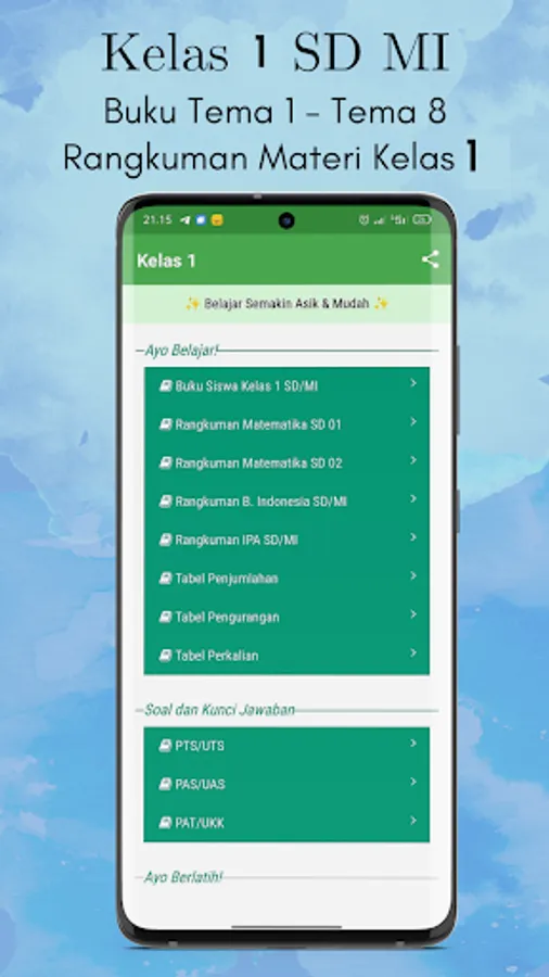 This application contains the Merdeka Class 1 Curriculum Book and the 2013 Class 1 Curriculum of SD / MI Complete with the Latest Revision, Answer Keys for Daily Tests, PAT, PAS, and Class 1 PTS.